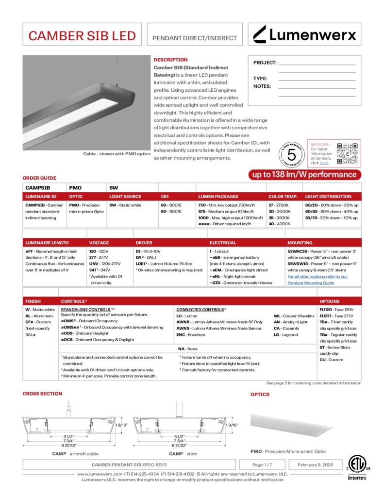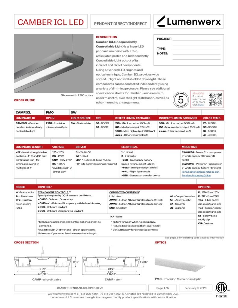 Camber is a linear pendant luminaire with a thin, articulated profile. Using advanced LED engines and optical control, Camber provides wide spread uplight and well controlled downlight. This highly efficient and comfortable illumination is offered in a wide range of light distributions together with comprehensive electrical and control options. Camber ICL, with Independently Controllable Light output of indirect and direct component is also available.