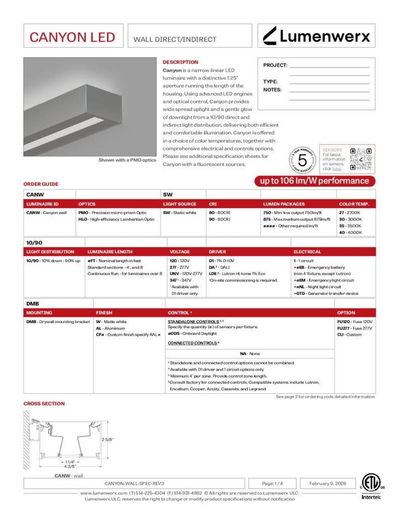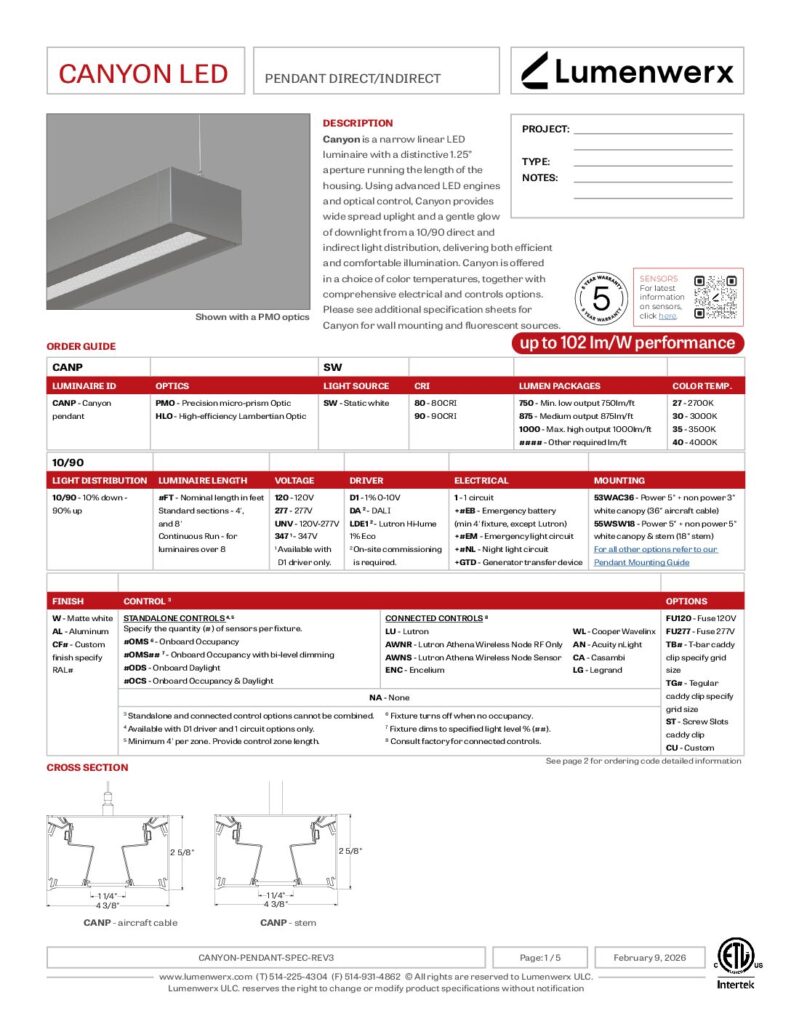 Canyon provides widespread uplighting and a gentle glow of downlighting from a 90/10 Indirect and Direct light distribution. Canyon is offered in a choice of light outputs and color temperatures, together with comprehensive electrical and control options.