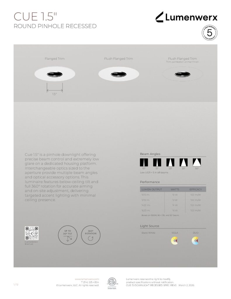 Cue 1.5″ is a pinhole downlight offering precise beam control and extremely low glare on a dedicated housing platform. Interchangeable optics sized to the aperture provide multiple beam angles and optical accessory options. This luminaire features below-ceiling tilt and full 360° rotation for accurate aiming and on-site adjustment, delivering targeted accent lighting with minimal ceiling presence.