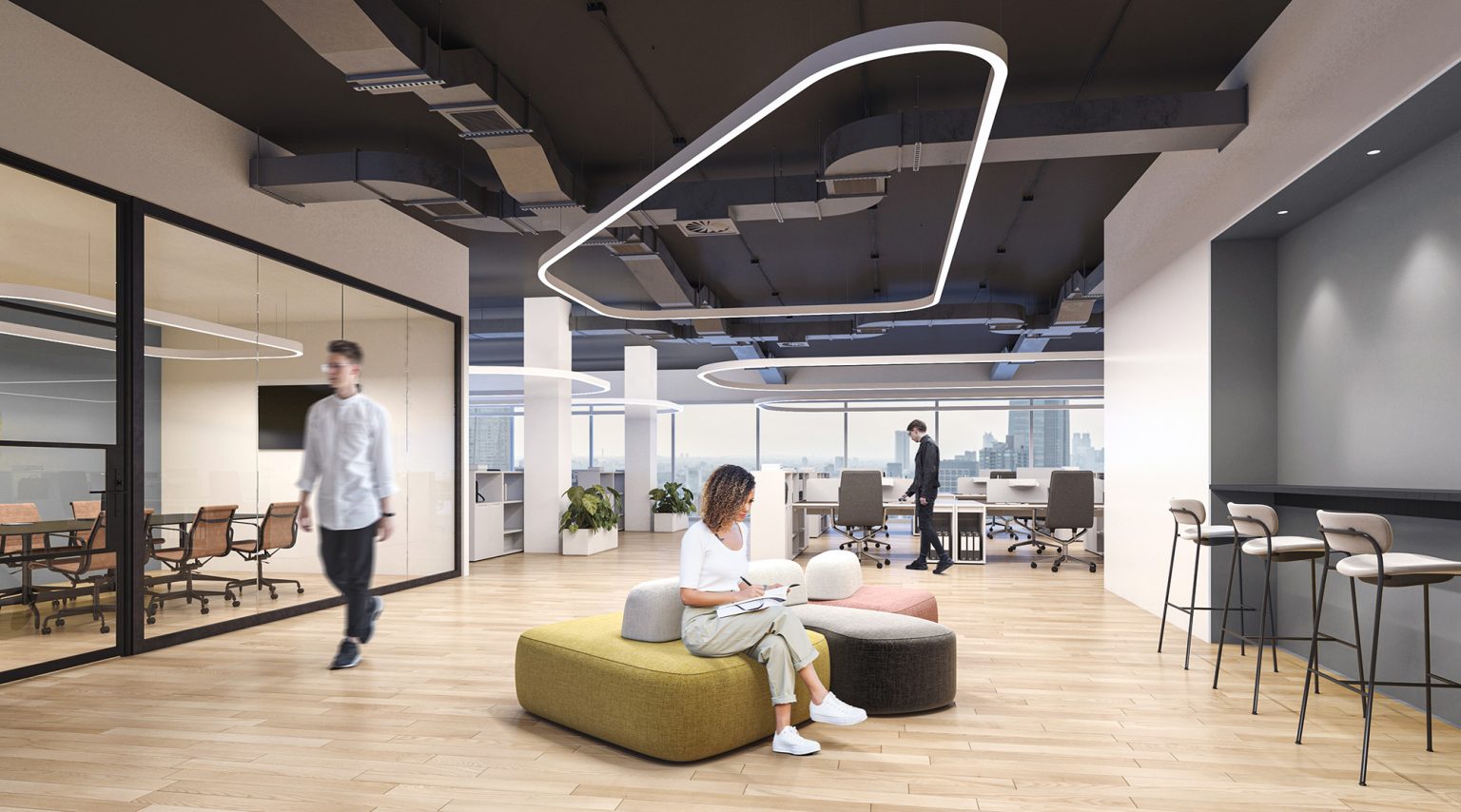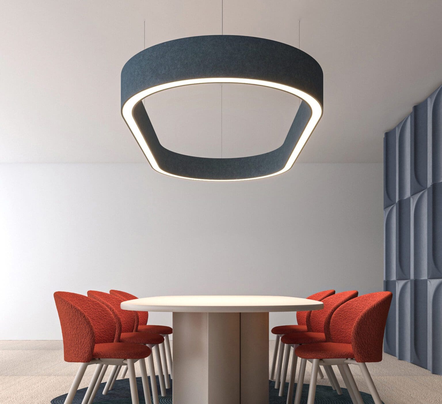 Curvia Acoustix blends curvilinear light with acoustic control, adding a sculptural aesthetic with integrated sound-absorbing properties. Optically equipped with either our High-Efficiency Lambertian Optic (HLO) or Asymmetrical Opal Optic (AOO), Curvia Acoustix is pendant-mounted for enhanced visual and acoustic comfort in quiet and inviting spaces.