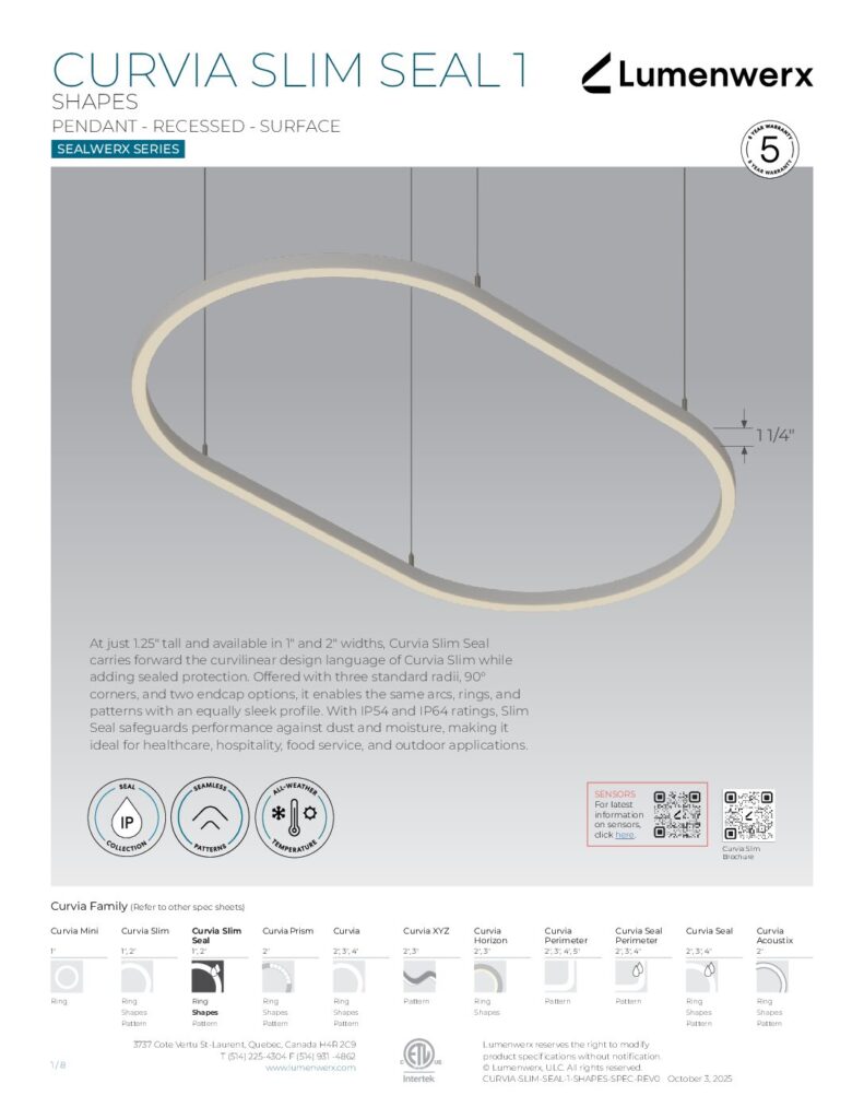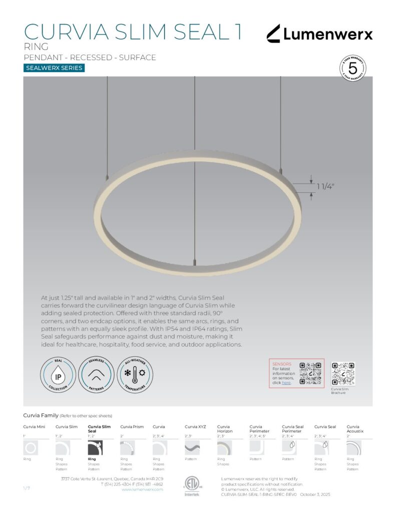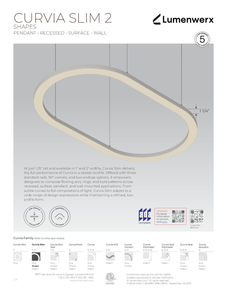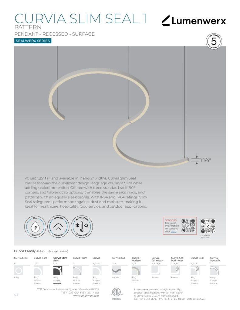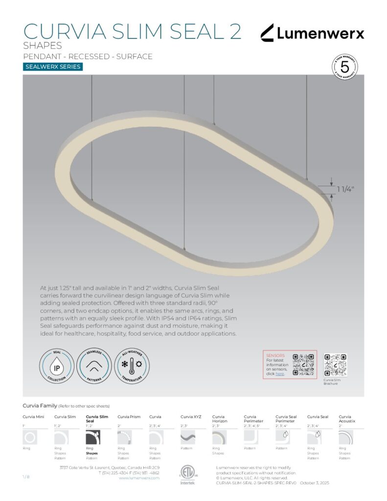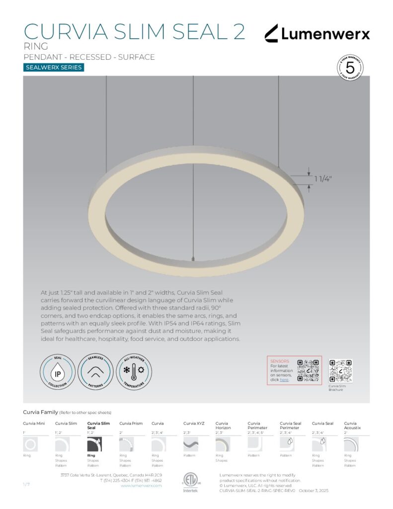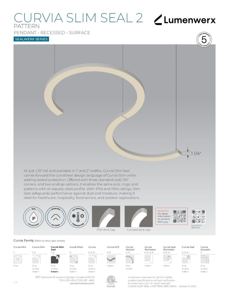 At just 1.25″ tall in 1″ and 2″ widths, Curvia Slim delivers Curvia’s full output in a slim profile. With three standard radii for curved corners and two end cap options, it enables flowing curves and bold patterns across pendant, recessed, surface, and wall/direct view applications. The Curvia Slim Seal extends this design language to demanding environments with IP54 and IP64 protection.
