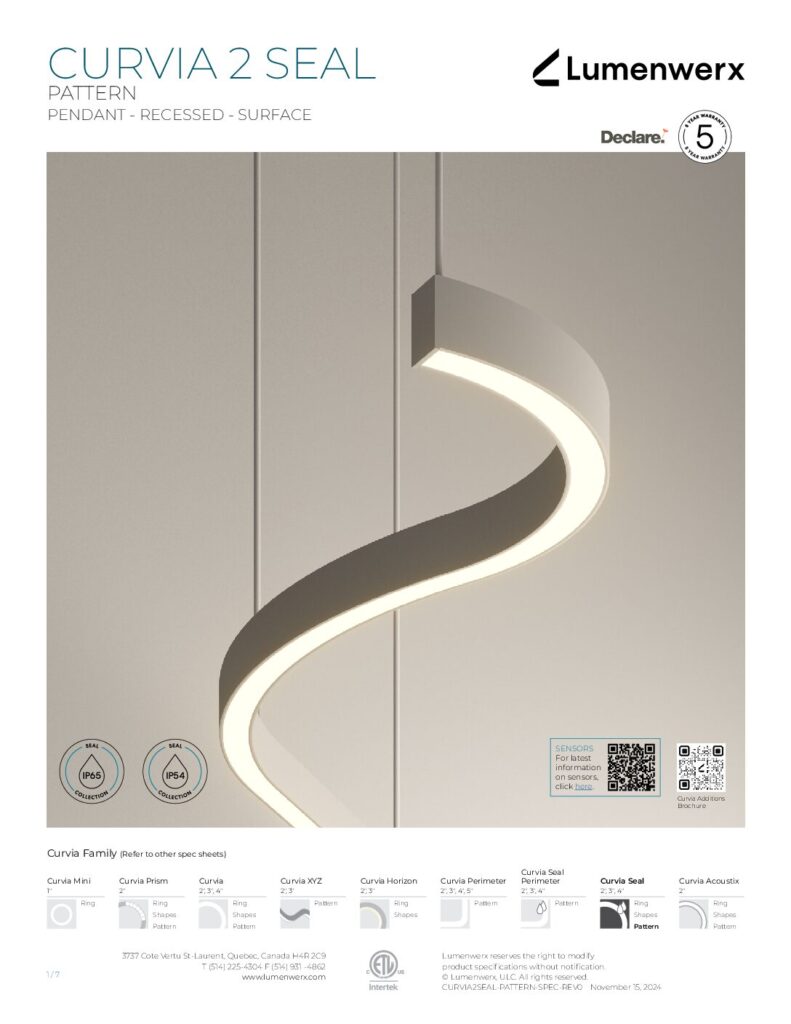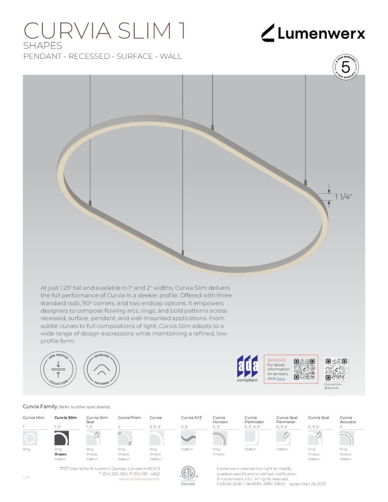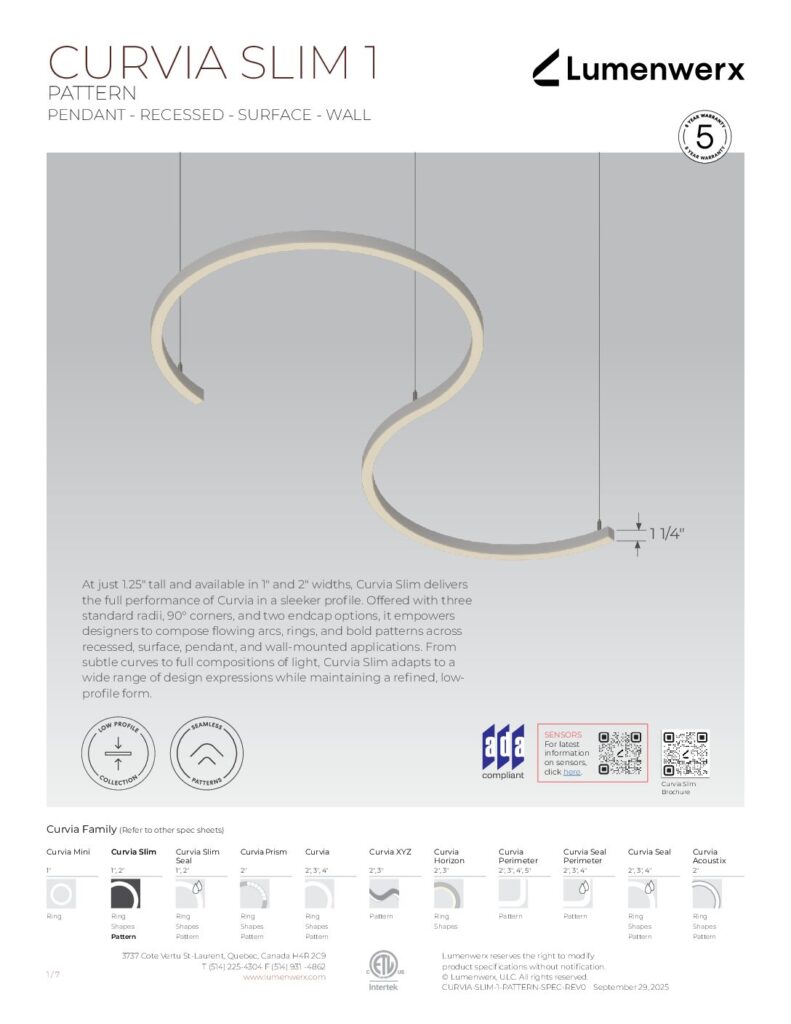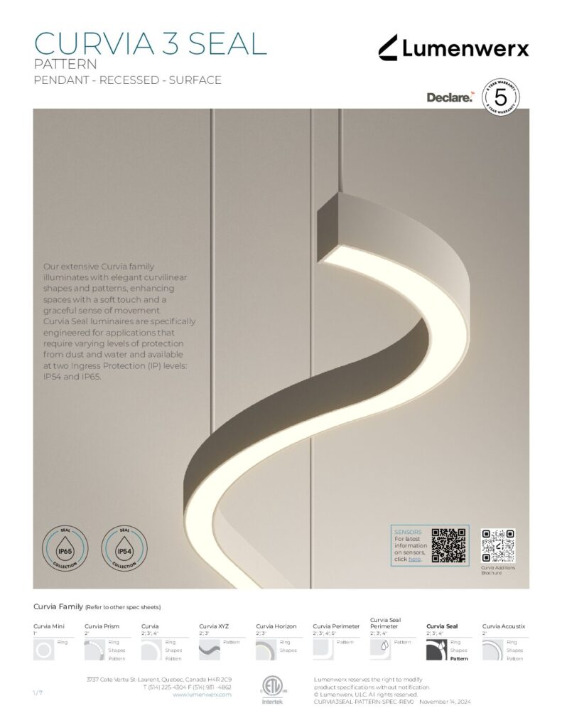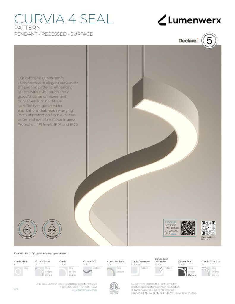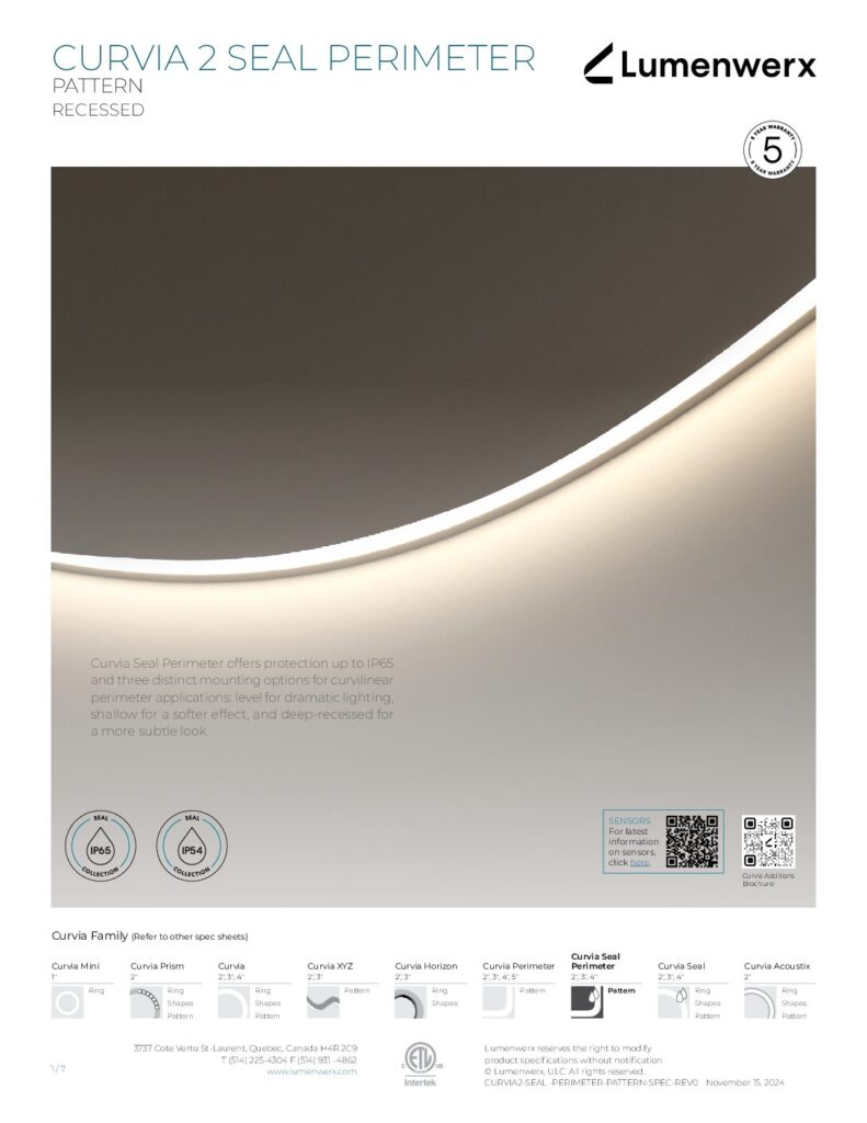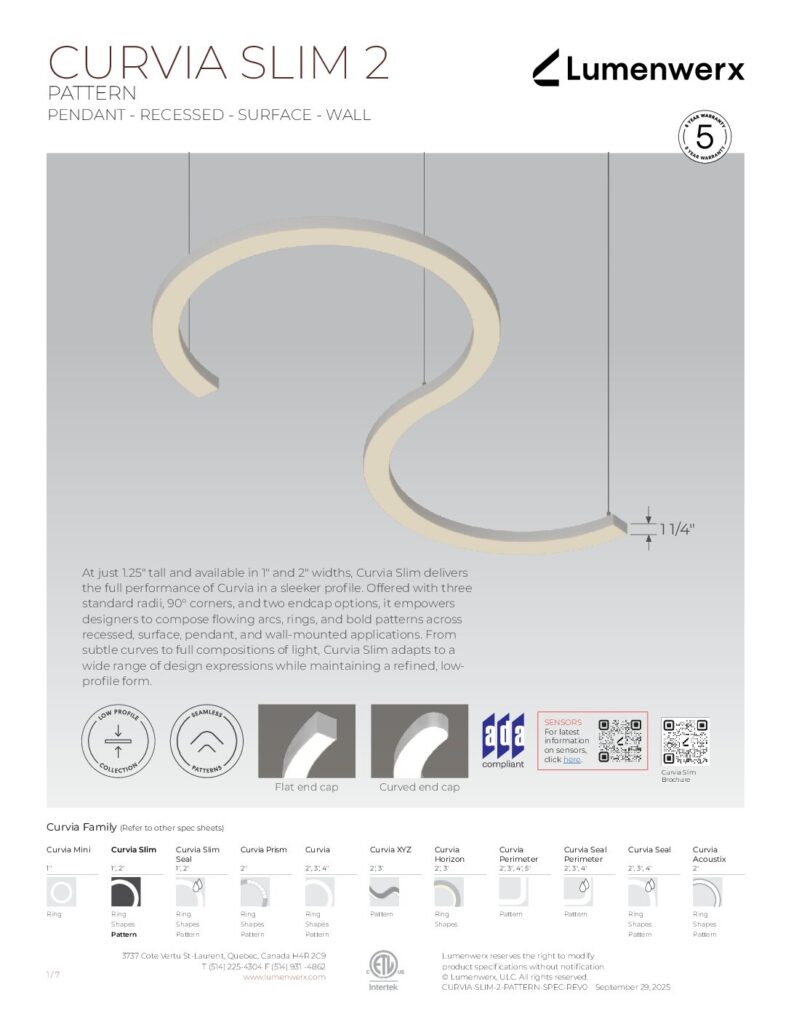 At just 1.25″ tall in 1″ and 2″ widths, Curvia Slim delivers Curvia’s full output in a slim profile. With three standard radii for curved corners and two end cap options, it enables flowing curves and bold patterns across pendant, recessed, surface, and wall/direct view applications. The Curvia Slim Seal extends this design language to demanding environments with IP54 and IP64 protection.