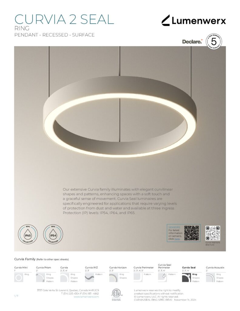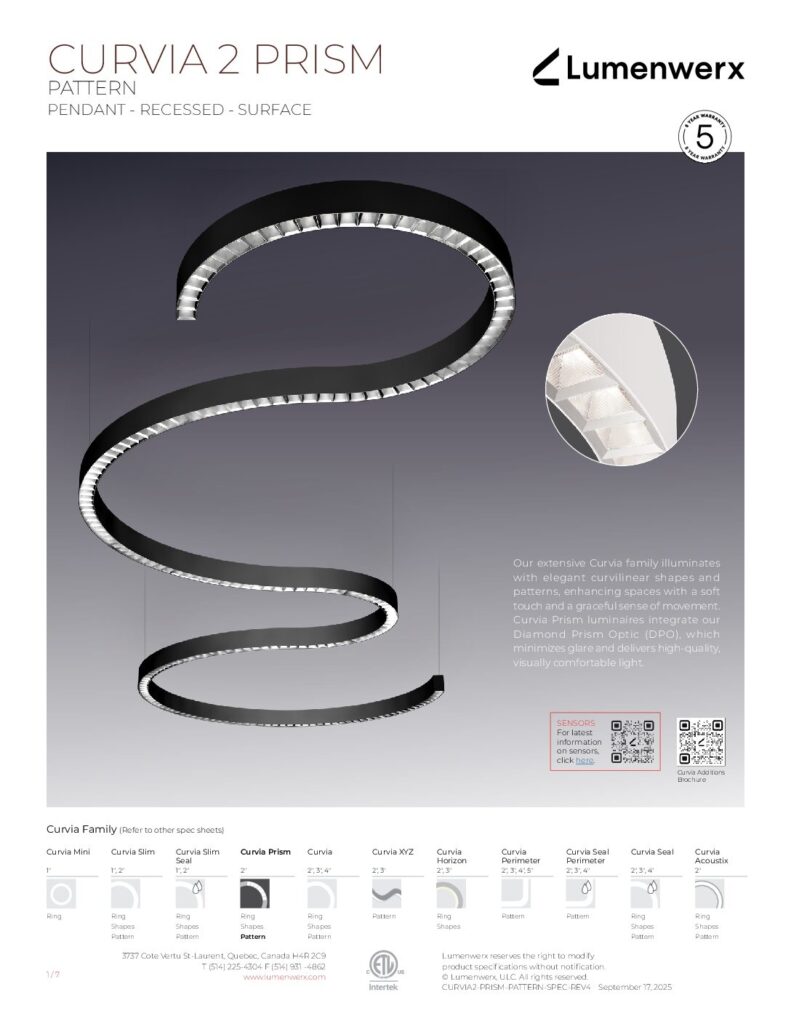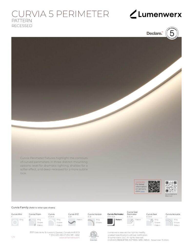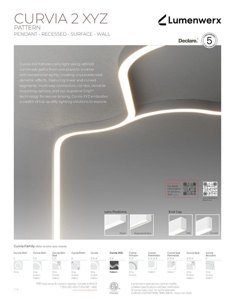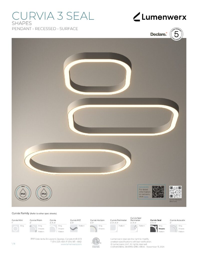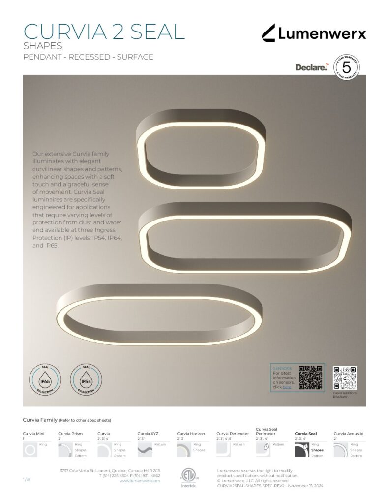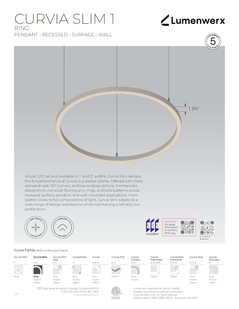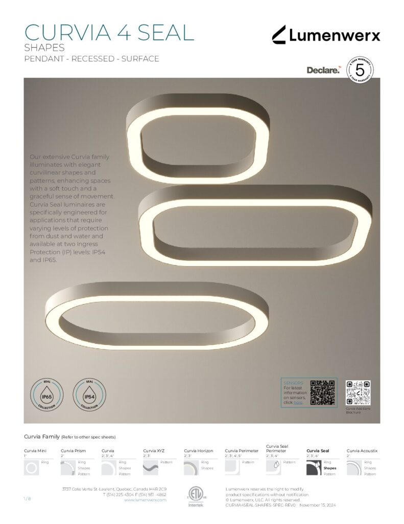 At just 1.25″ tall in 1″ and 2″ widths, Curvia Slim delivers Curvia’s full output in a slim profile. With three standard radii for curved corners and two end cap options, it enables flowing curves and bold patterns across pendant, recessed, surface, and wall/direct view applications. The Curvia Slim Seal extends this design language to demanding environments with IP54 and IP64 protection.