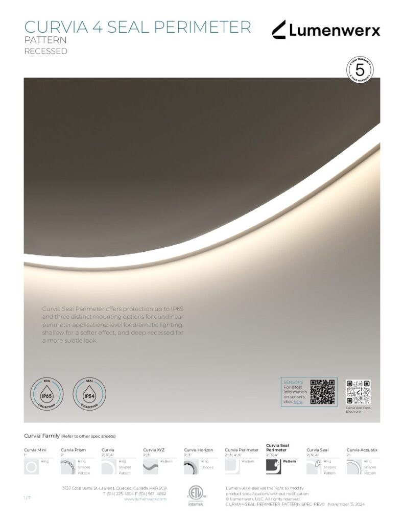 Curvia Seal Perimeter offers three profile sizes (2″, 3″, and 4″), two protective options (IP54 and IP65), and three mounting choices (level for dramatic lighting, shallow for a softer effect, and deep-recessed for more subtle looks).