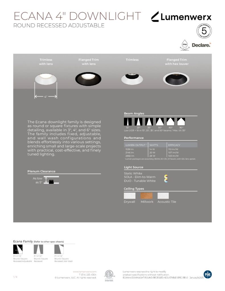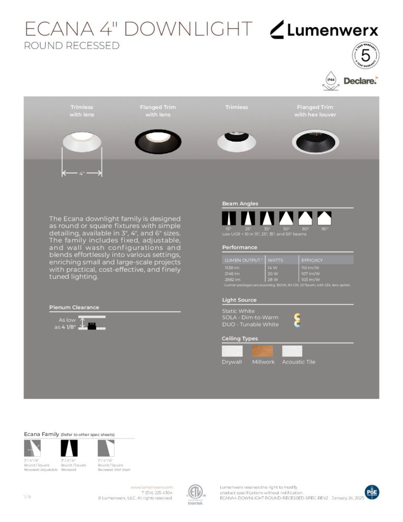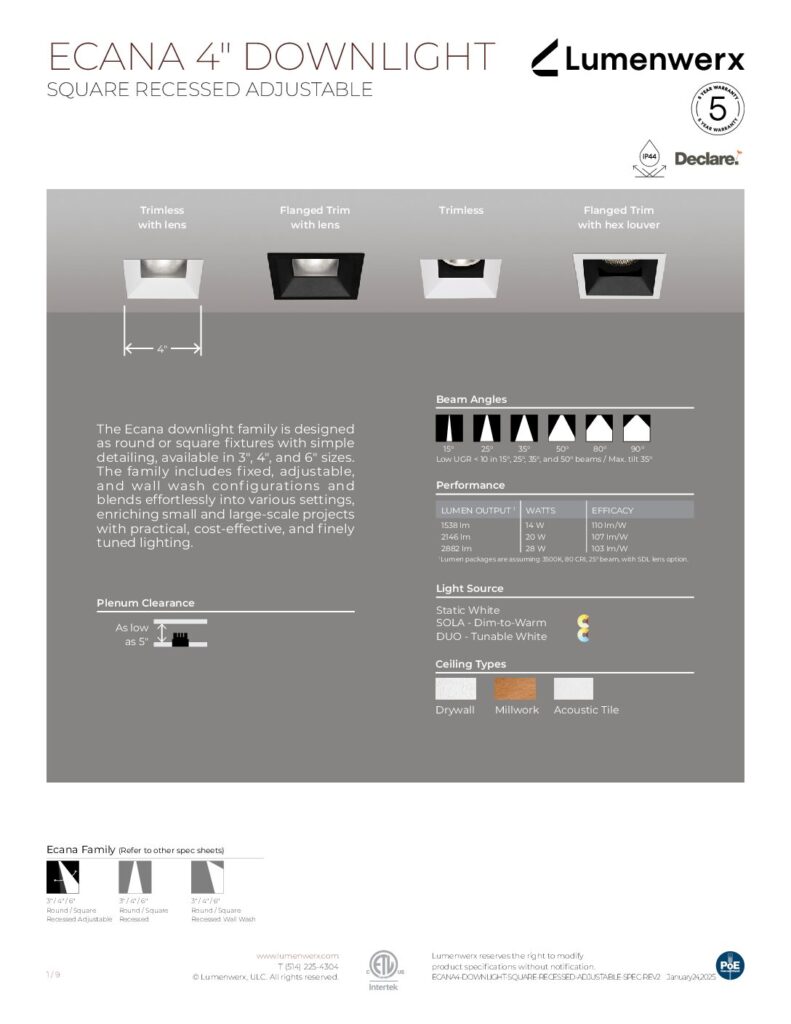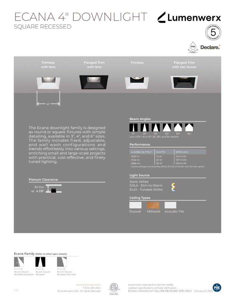 DownlightsAs versatile and refined as you need them to be, Ecana downlights can be customized with a variety of accessories, trims, color temperatures and control options. Available in square or round formats, in 3″, 4″, and 6″ sizes.