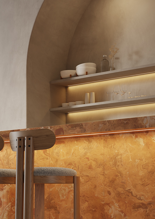 Minear’s recessed mounting offers a concealed installation in wood slats, drywall, and other hard surfaces, revealing only a clean line of light.