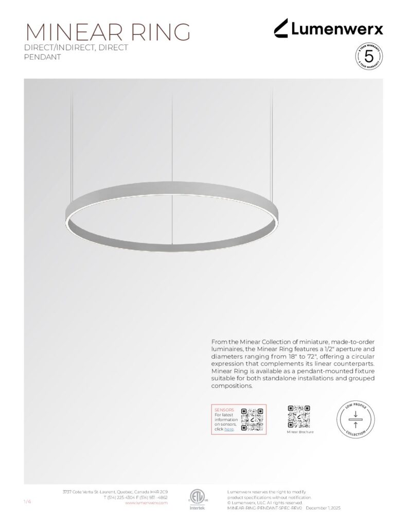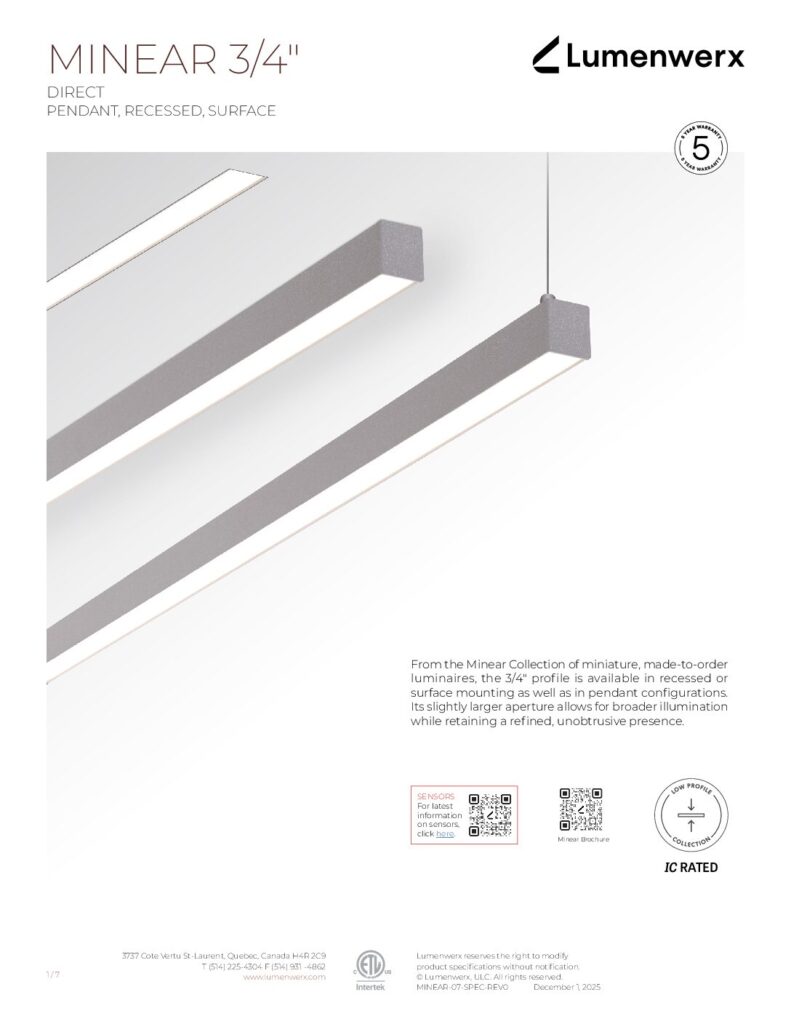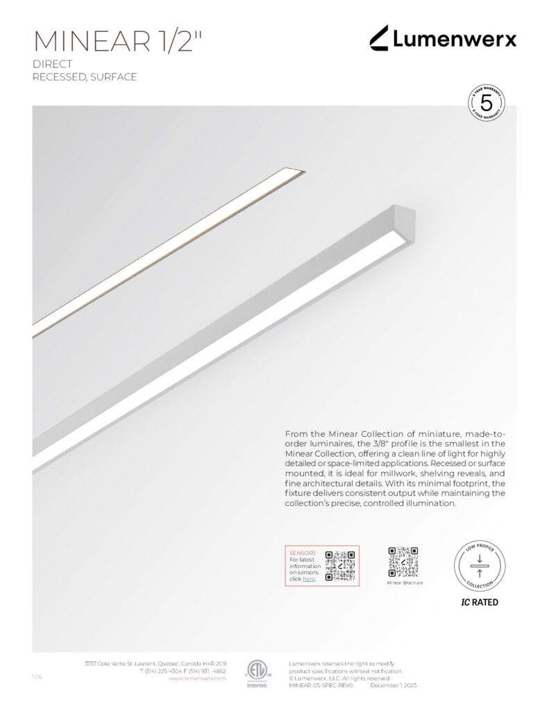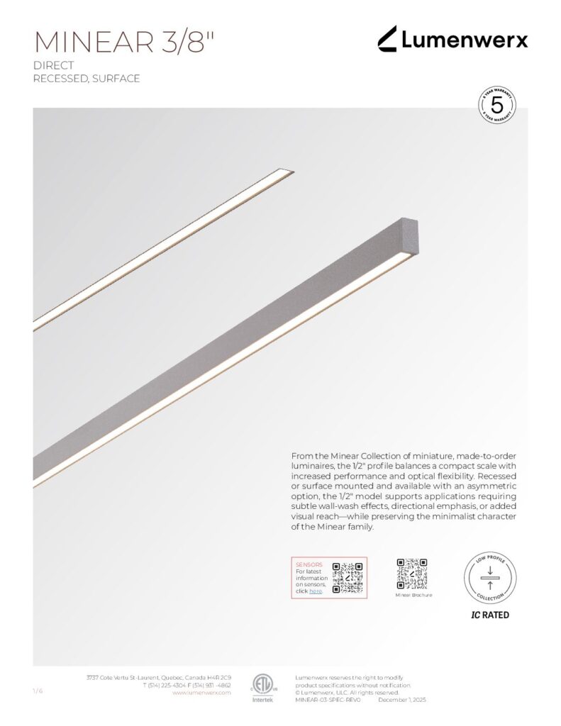 Explore the Minear Collection The Minear Collection is a curated collection of miniature, made-to-order architectural luminaires, including both linear profiles and ring-shaped models. Minear Linear is offered in 3/8", 1/2", and 3/4" apertures and is engineered with rigid, high-efficiency boards to deliver strong output and consistent performance.