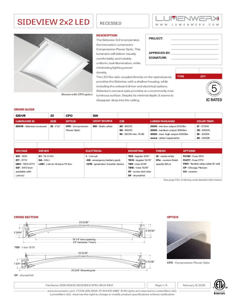 Sideview offers three lumen packages from 2000 to 4000 lumens, with luminaire efficacy up to 87 lm/W. Custom arrays maintain the three color temperature options within three SDCM. Dimmable drivers, either digital or analog, are standard. They operate the LEDs at reduced temperatures, achieving L80 beyond 60,000 hours. Clean detailing assures compatibility with typical ceiling types. Both driver and LED cartridges are field-replaceable.