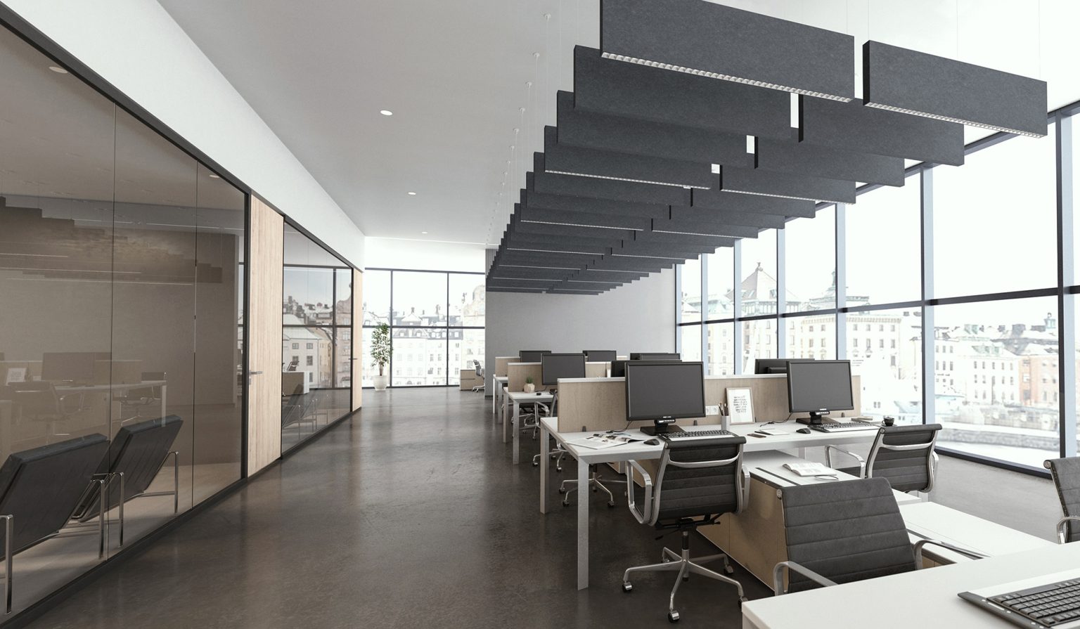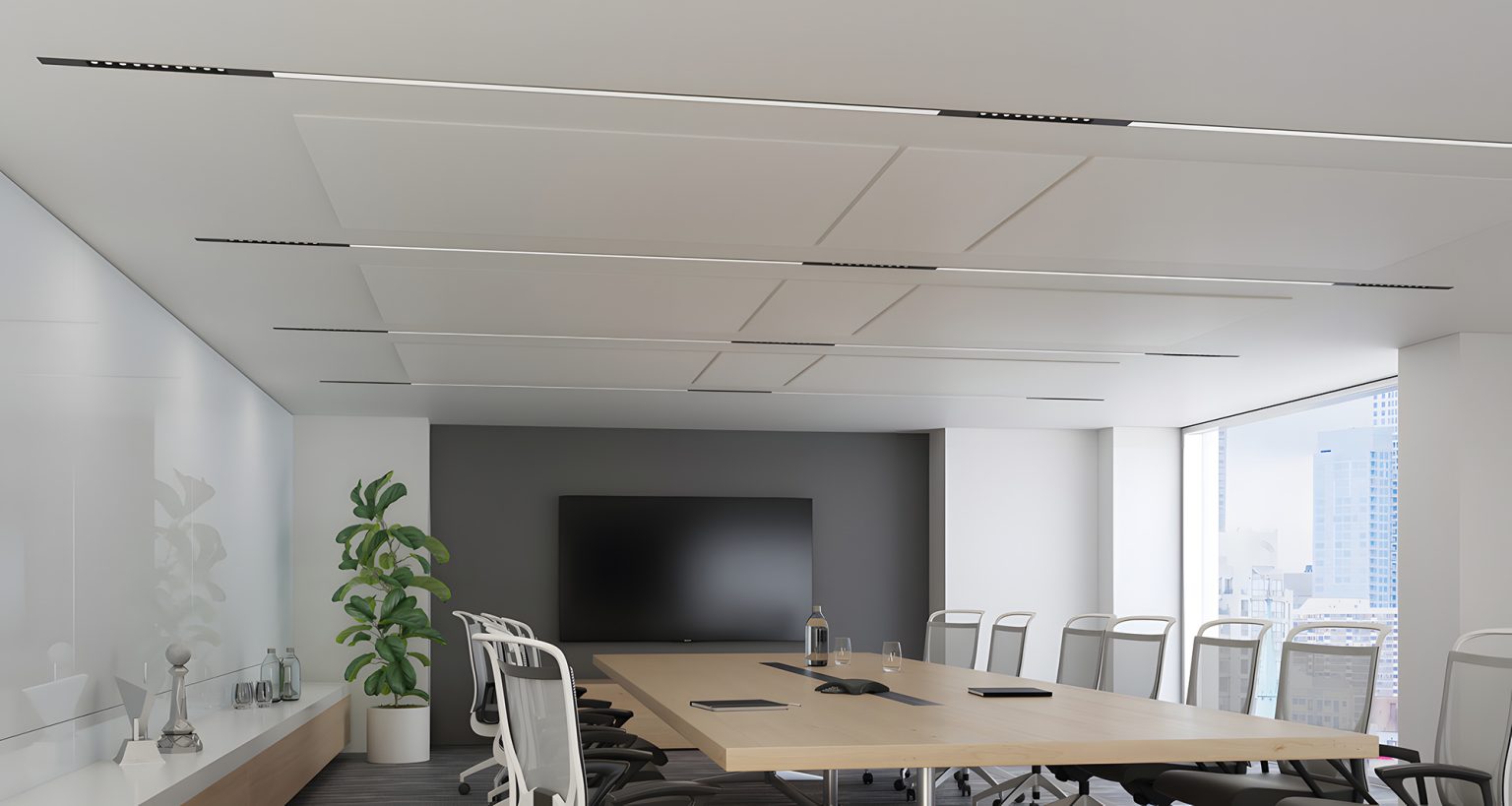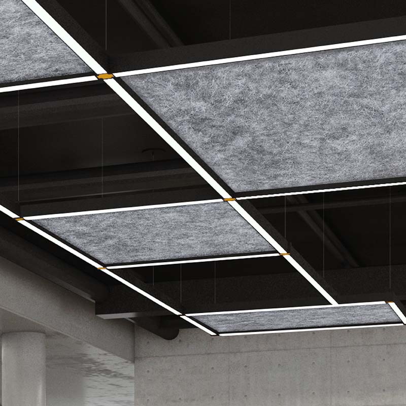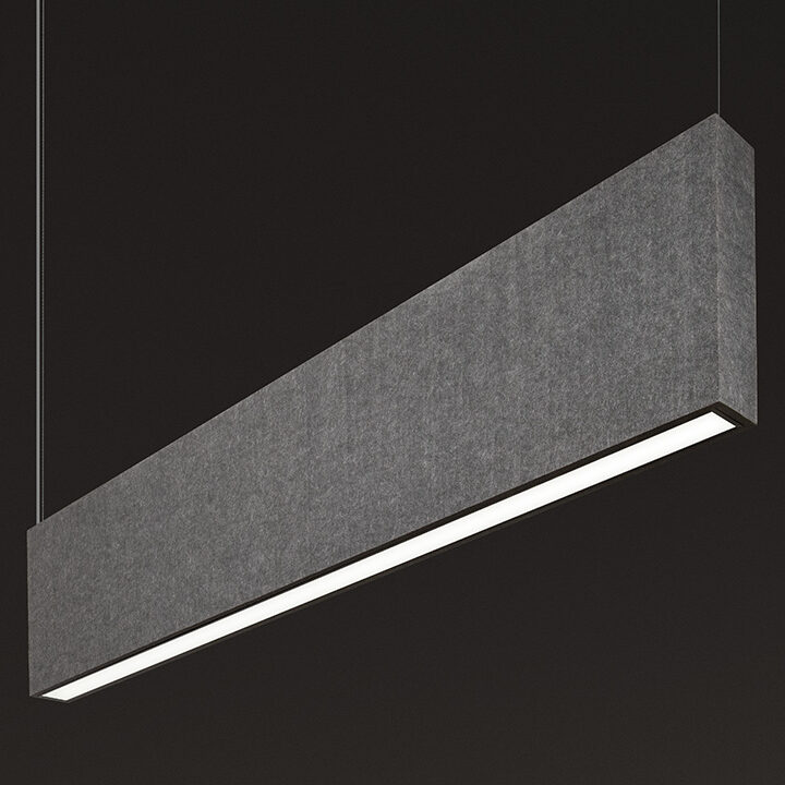 Made using fine-cut acoustic felt, Squero Acoustix sports a crisp flat end cap and offers four standard optics for advanced illumination: matte parabolic louver, specular parabolic louver, Miniature Reflector Optic (MRO), and High-Efficiency Lambertian Optic (HLO). Adjustable accent modules also available.