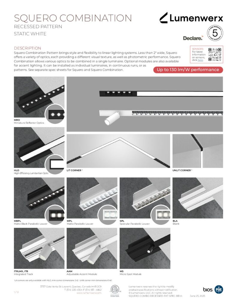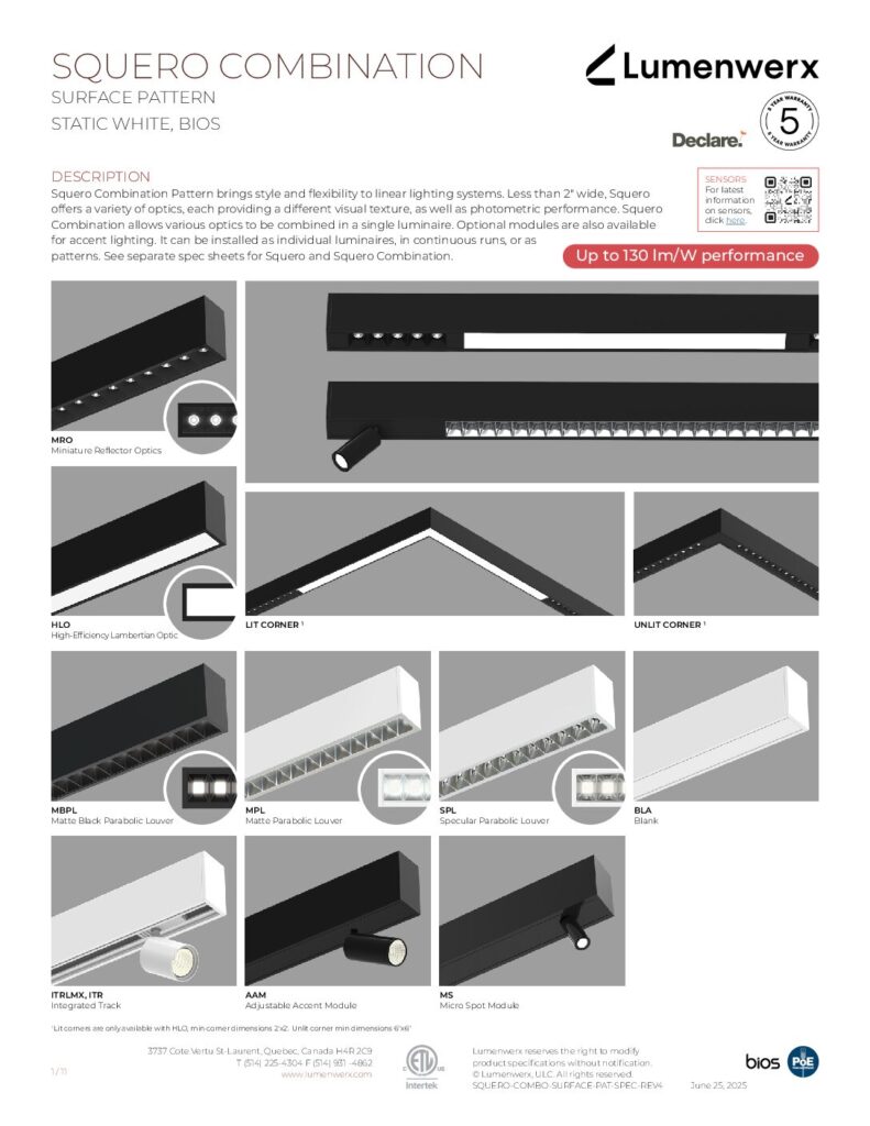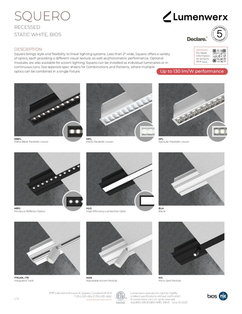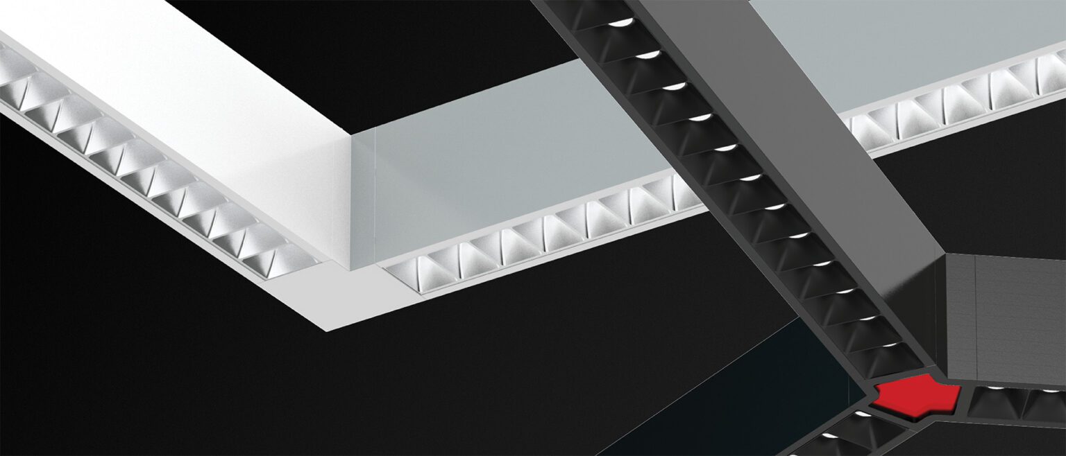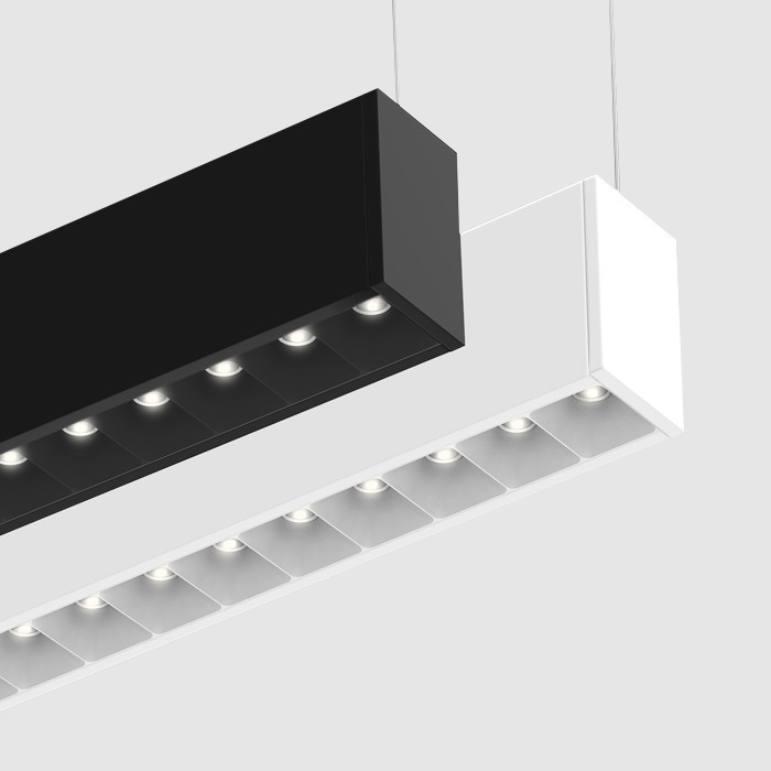 Squero brings new style and texture to linear lighting systems. It offers a crisp profile, multiple mounting options, distinctive optics, and the ability to arrange those optics in custom combinations. Less than 2″ wide, the collection offers a variety of visual textures, both in the appearance of the luminaire and in the quality of the light. Squero installs in various ceiling types and walls, or as a pendant. It also works as a single luminaire or in continuous runs, and in patterns with both level and inside corners.