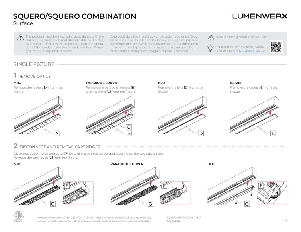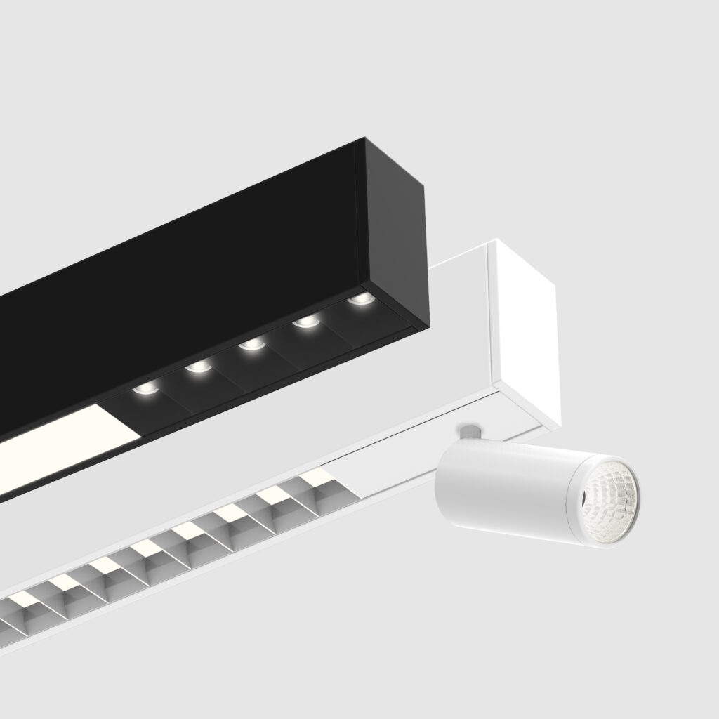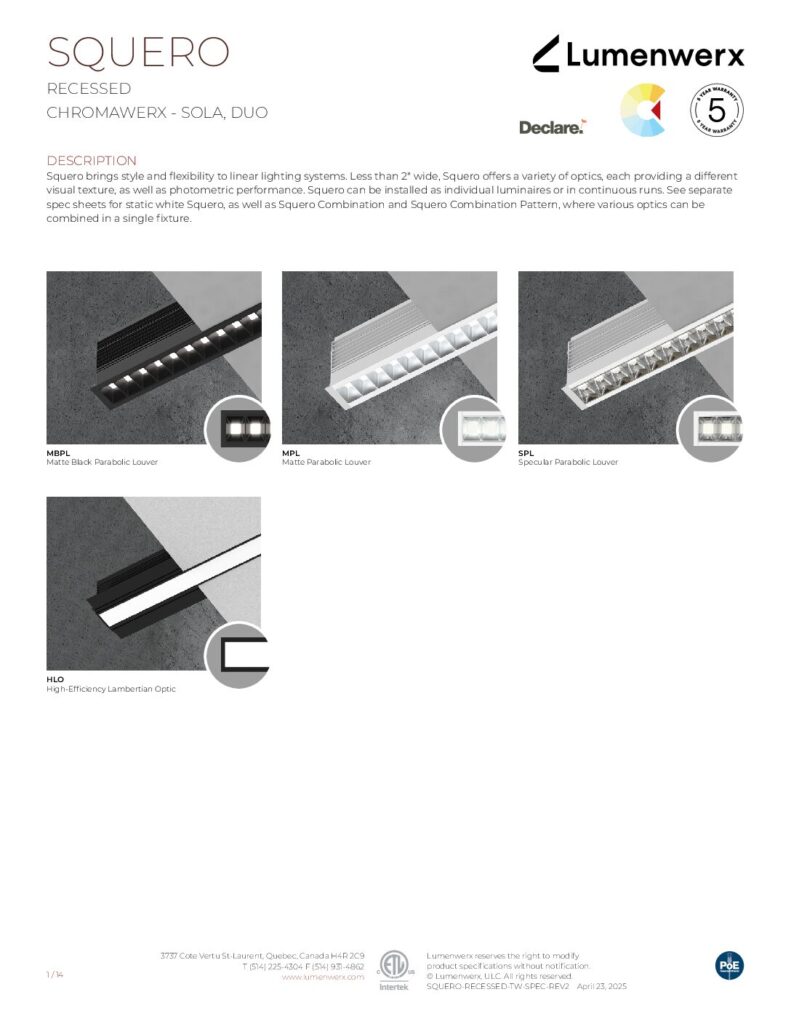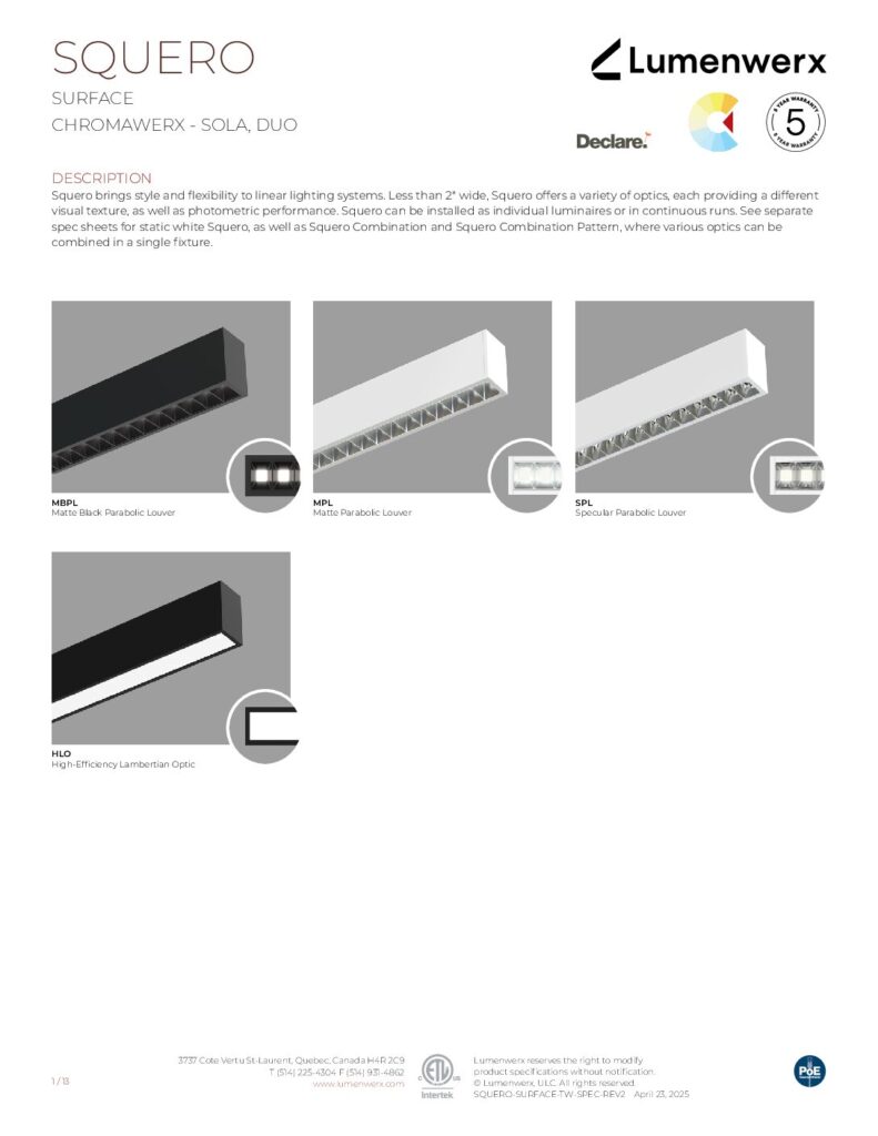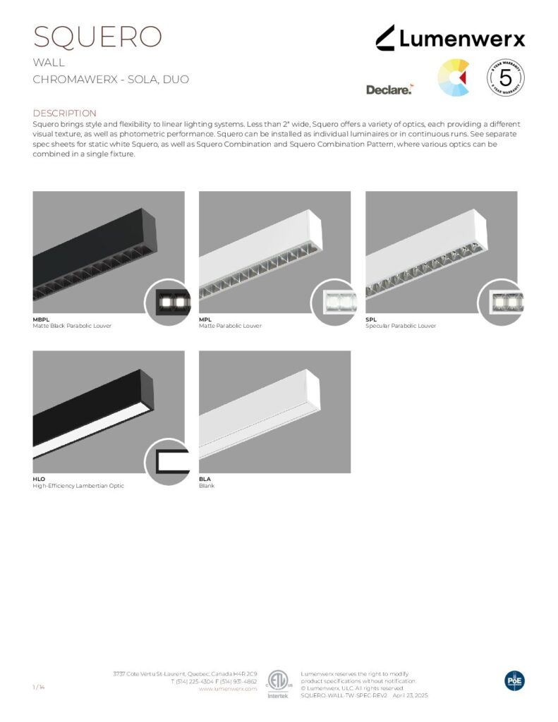 Squero brings new style and texture to linear lighting systems. It offers a crisp profile, multiple mounting options, distinctive optics, and the ability to arrange those optics in custom combinations. Less than 2″ wide, the collection offers a variety of visual textures, both in the appearance of the luminaire and in the quality of the light. Squero installs in various ceiling types and walls, or as a pendant. It also works as a single luminaire or in continuous runs, and in patterns with both level and inside corners.