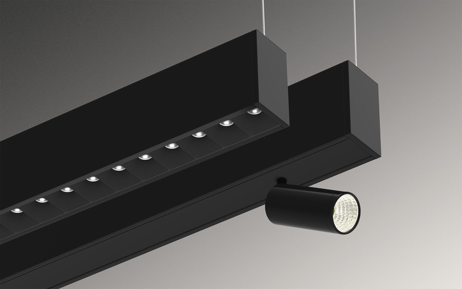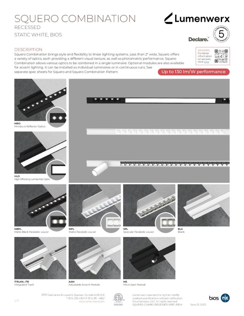 Unleash your creativity by mounting any of Squero’s six optics as discrete luminaires, continuous runs, or custom patterns. Richly layered effects can also be created by combining indirect, diffuse direct, and concentrated direct illumination modules from various Squero optics.