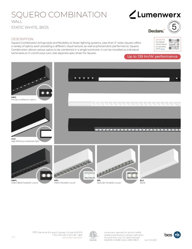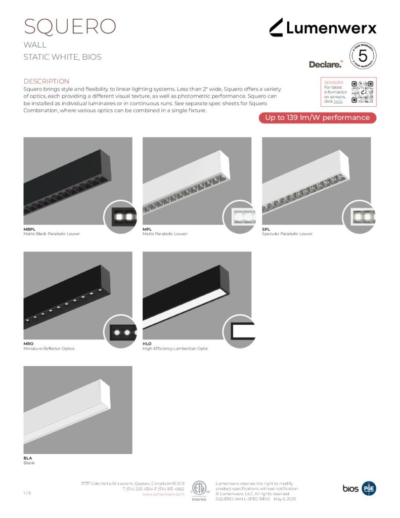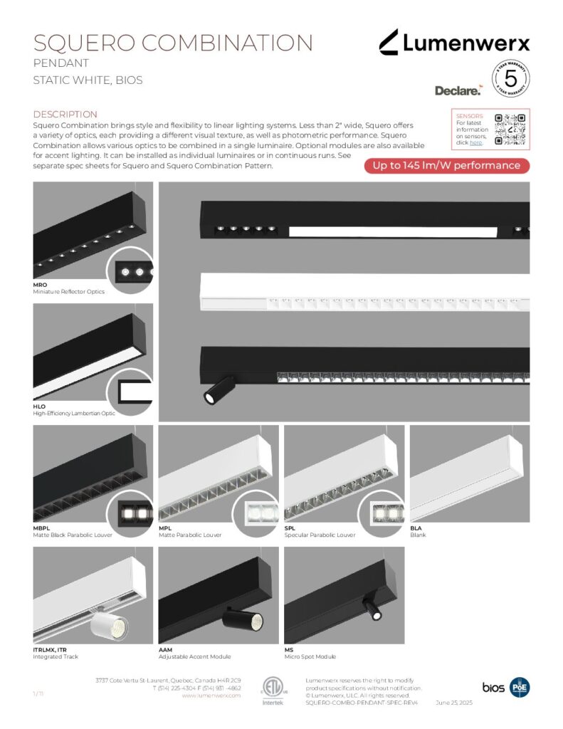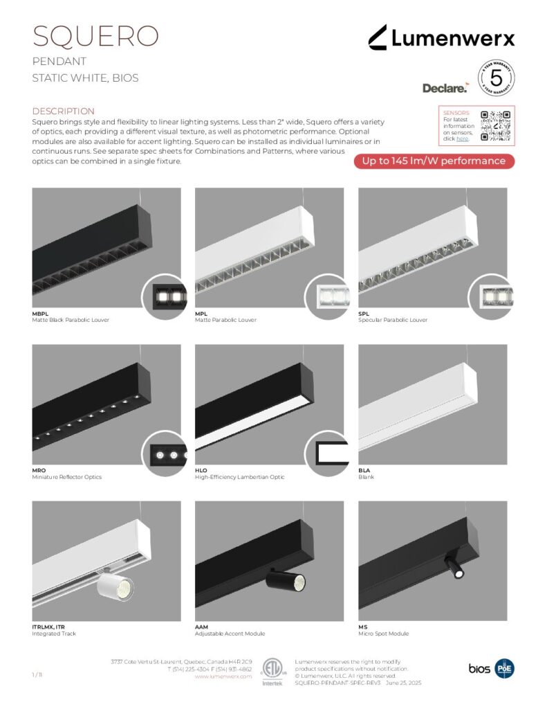 Squero delivers distinctive optics for direct illumination. Choose from parabolic louver, miniature reflector, or HLO diffuser, each with its own luminous presence and photometric performance. For indirect illumination, Squero luminaires offer a widespread optic that can be combined into a single luminaire with an adjustable accent module, customizable for any application.