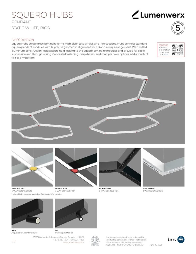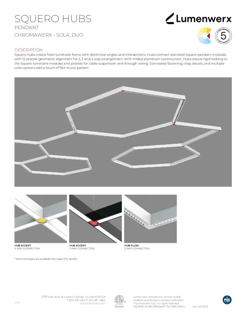 With 12 options to choose from, Squero Hubs create fresh luminaire forms with distinctive angles and intersections. Hubs are locked into Squero luminaire modules and provide cable suspension and through wiring. Add a touch of color to dazzle the eye and set a lively visual beat to your Squero Hubs pattern. Lighting doesn’t have to be so linear.
