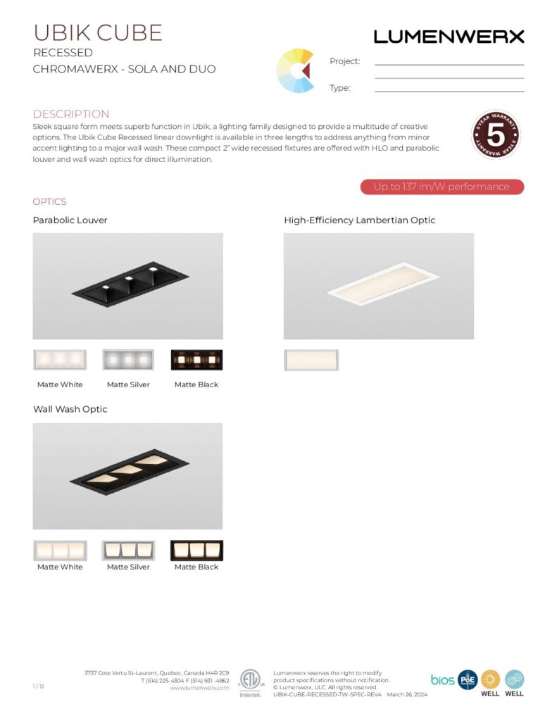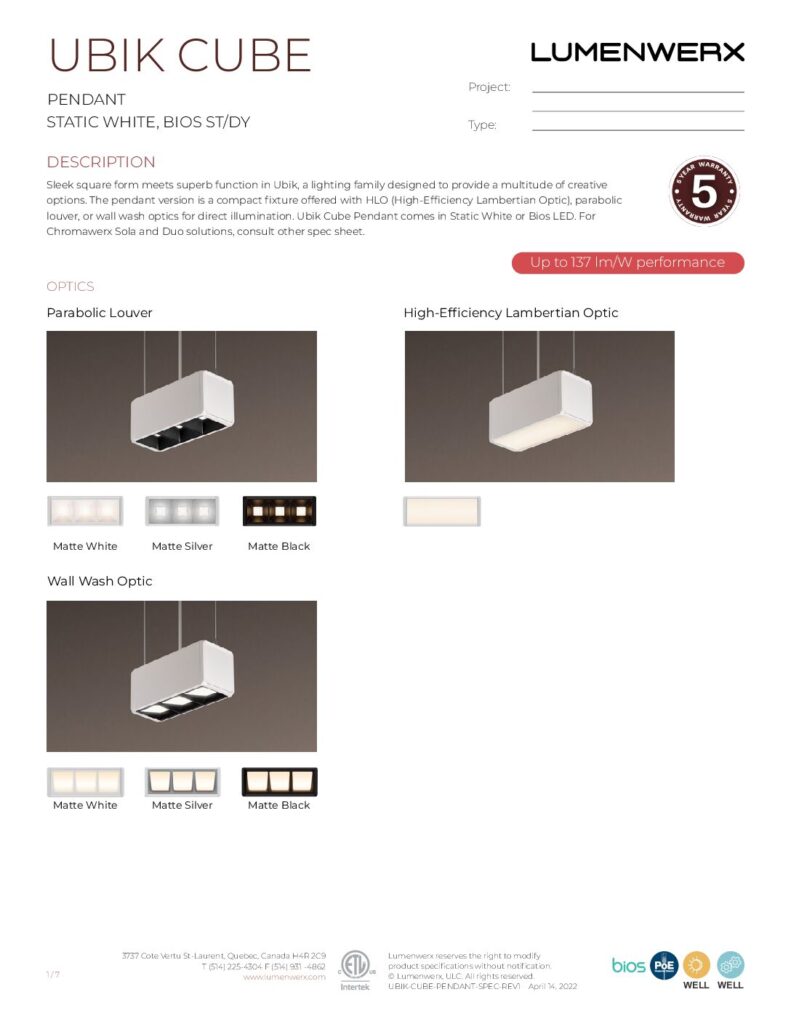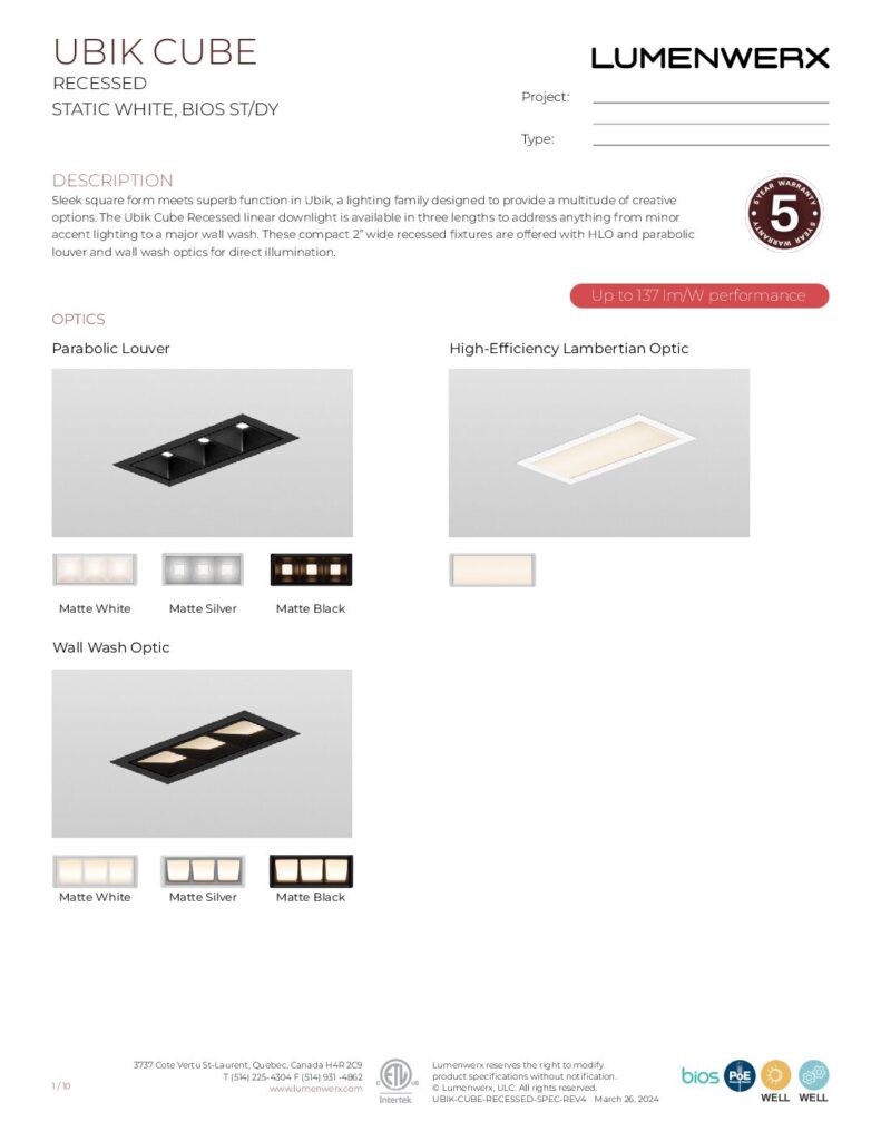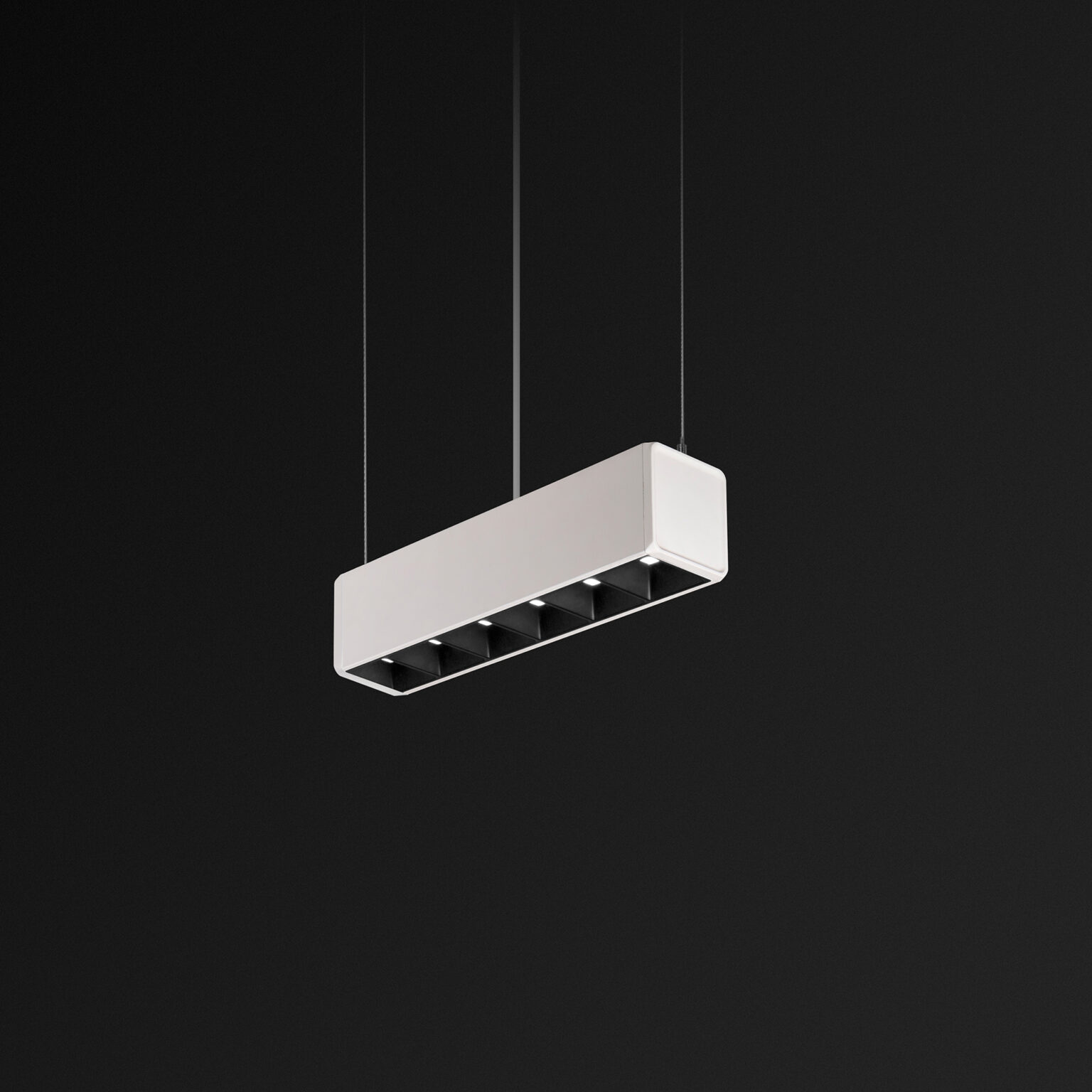 Compact, flexible, and powerfulAs linear downlights or stylish pendants, Ubik Cubes are offered in three, six, or nine cells, with parabolic louvers, HLO, or wall wash optics, and up to 2400 lumens.