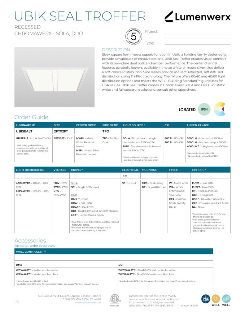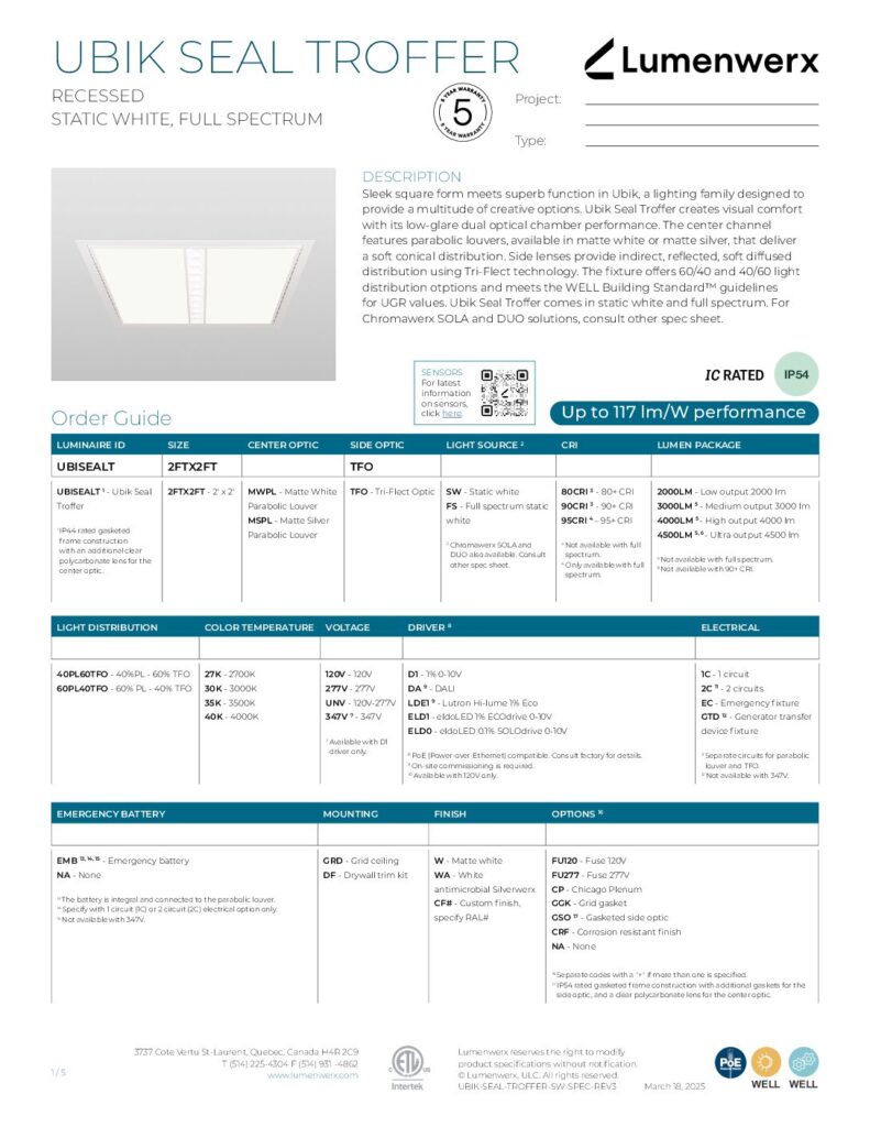 Fully sealed with IP54 ratingUbik Seal’s 2×2 Troffers offer style, sophistication, and two color options in a center channel parabolic louver. For enhanced functionality, choose two circuit control–one for center channel louvers and another for side lenses.