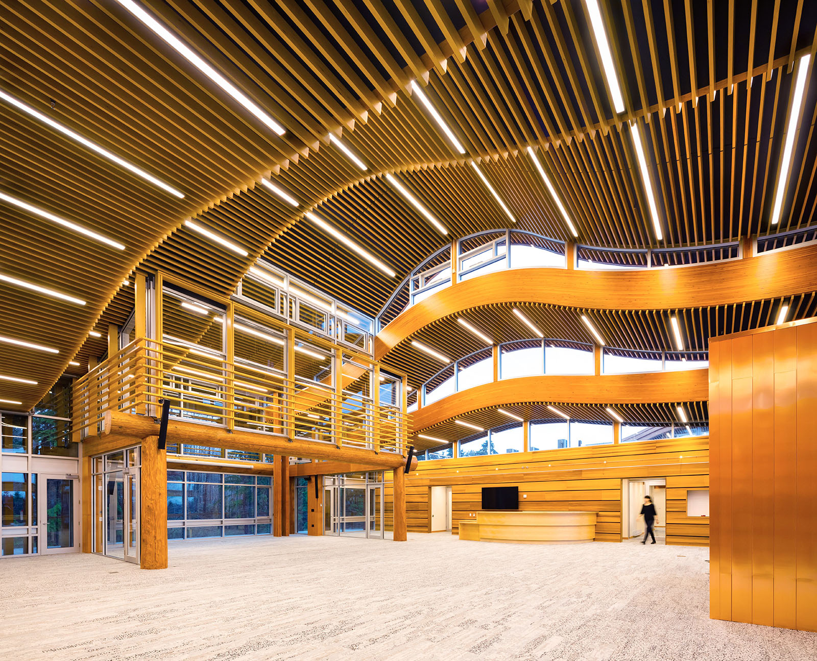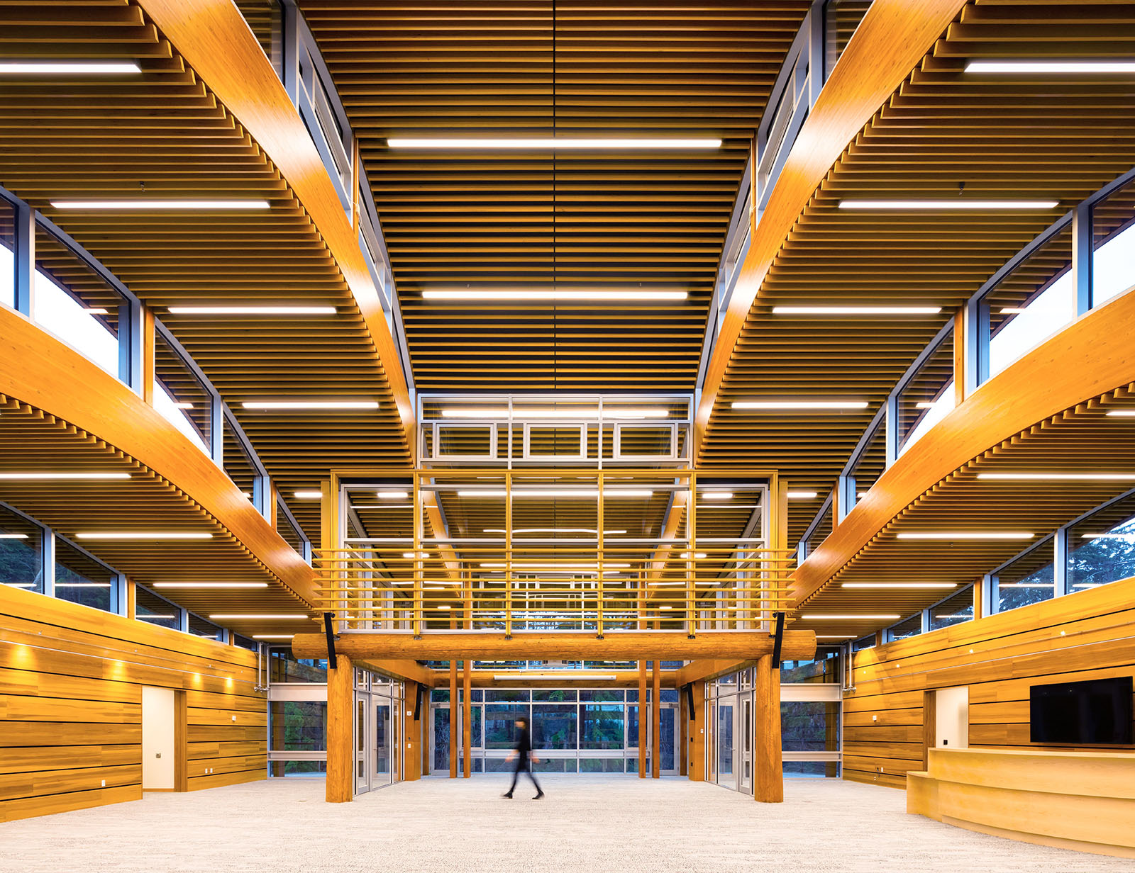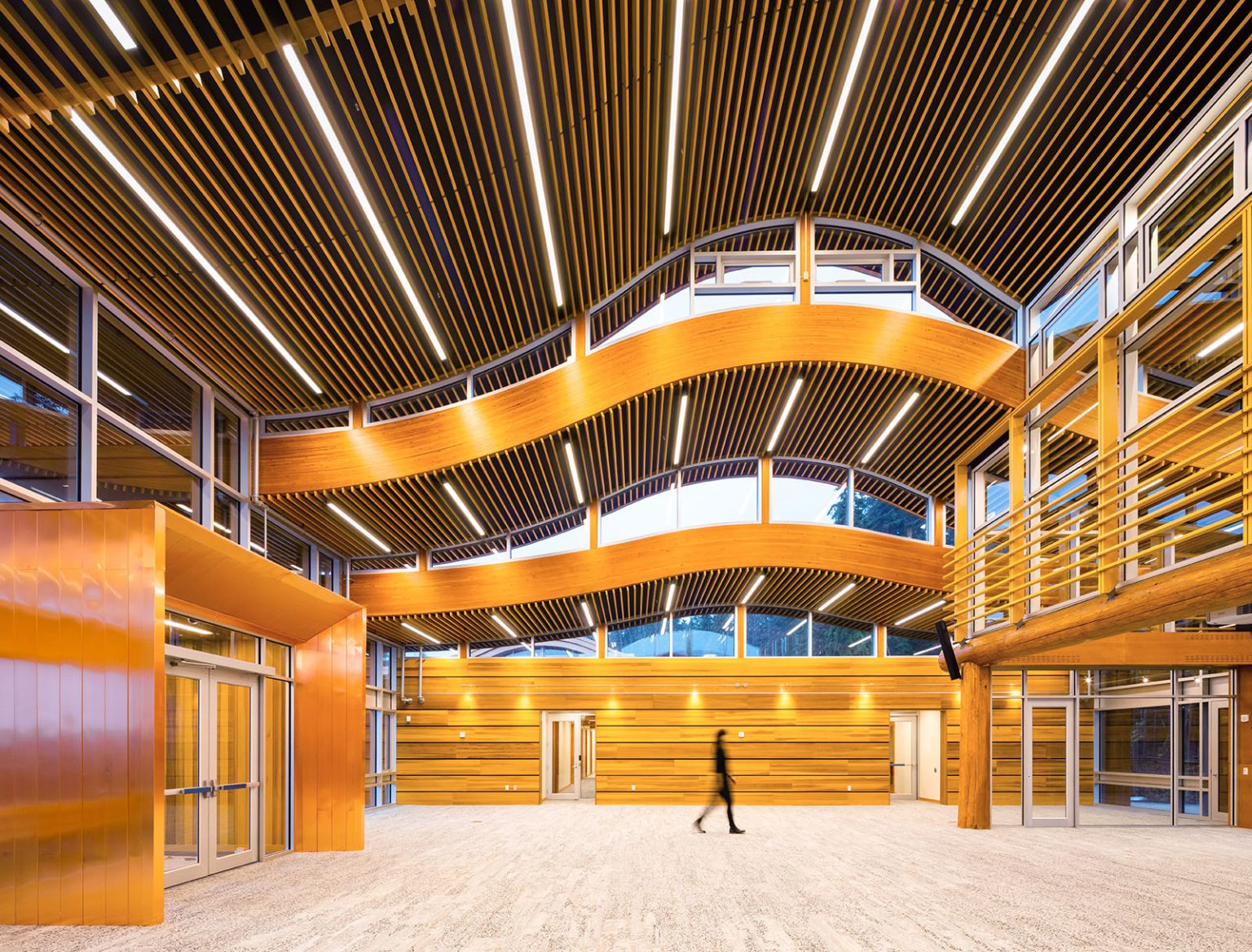 Merveille de la construction durable en bois, le centre d’administration et de santé de la Nation Tsleil-Waututh constitue le cœur de la Première Nation TsleilWaututh, en Colombie-Britannique. Lieu de rassemblement pour la gouvernance, les soins de santé et l’engagement communautaire, ce bâtiment conçu par Lubor Trubka Associates Architects d’une superficie de 31 000 pieds carrés, est envisagé comme une structure où la lumière exprime une harmonie avec le monde naturel.