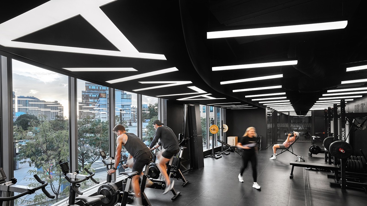 Dans les espaces axés sur le design, nos luminaires suspendus Squero, toujours en noir sur fond de plafond blanc, offrent une solution flexible et ciblée qui permet de réaliser des tâches complexes. Dans un jeu similaire de lumière et d’obscurité, nos suspensions rondes étroites Quad occupent le devant de la scène dans le gymnase de l’entreprise. Elles offrent une définition spatiale et un éclairage suffisant pour les séances d’entraînement, tout en créant une présence brillante et pleine d’énergie sur les murs et le plafond noircis de la salle de sport.
