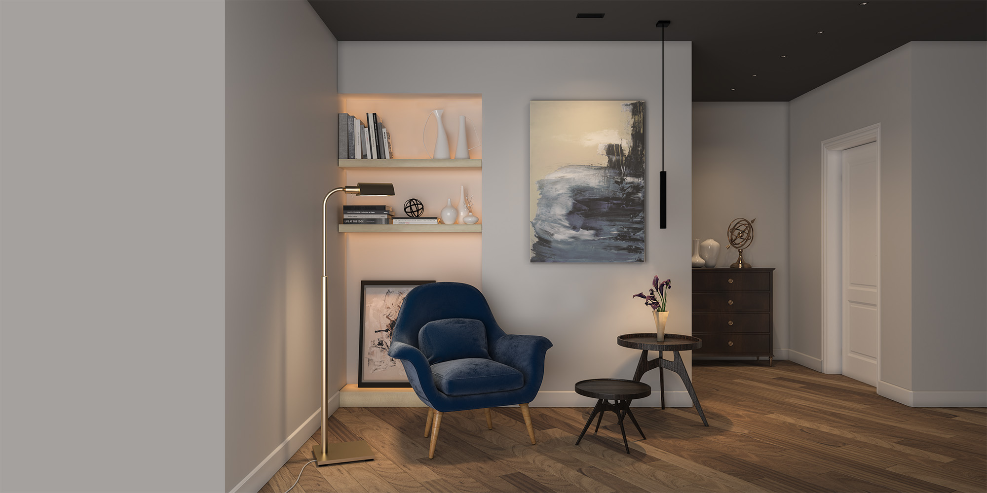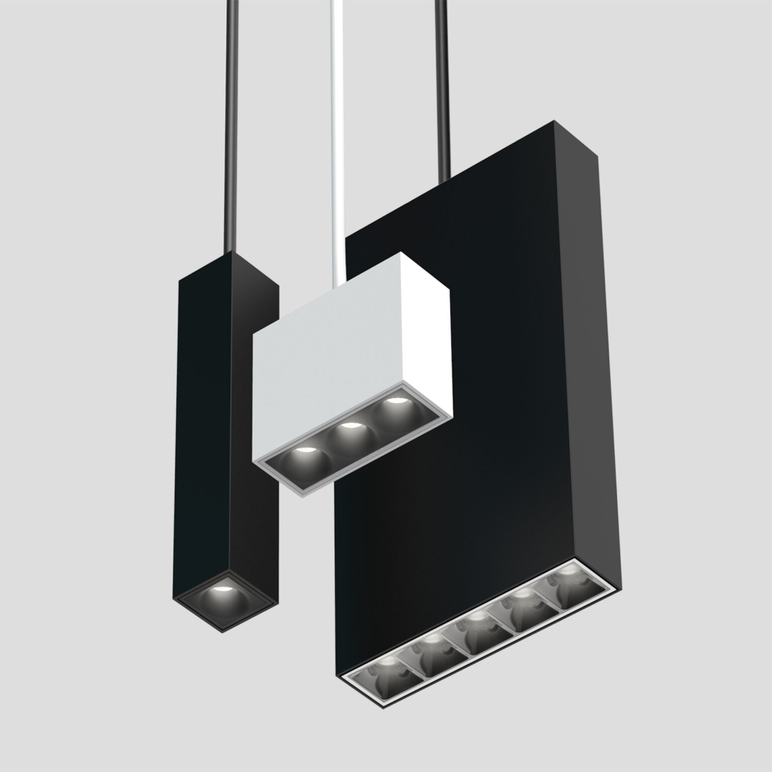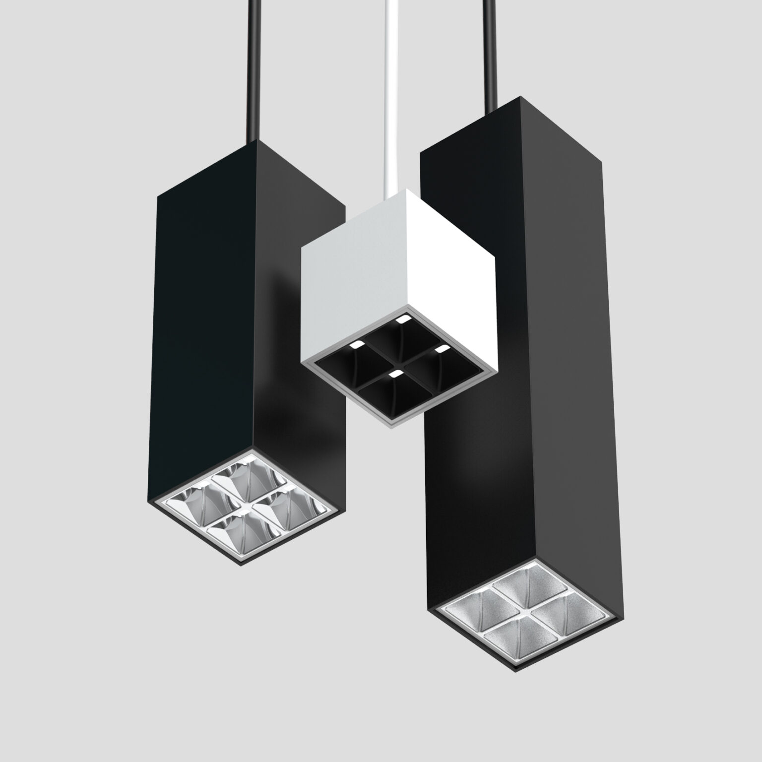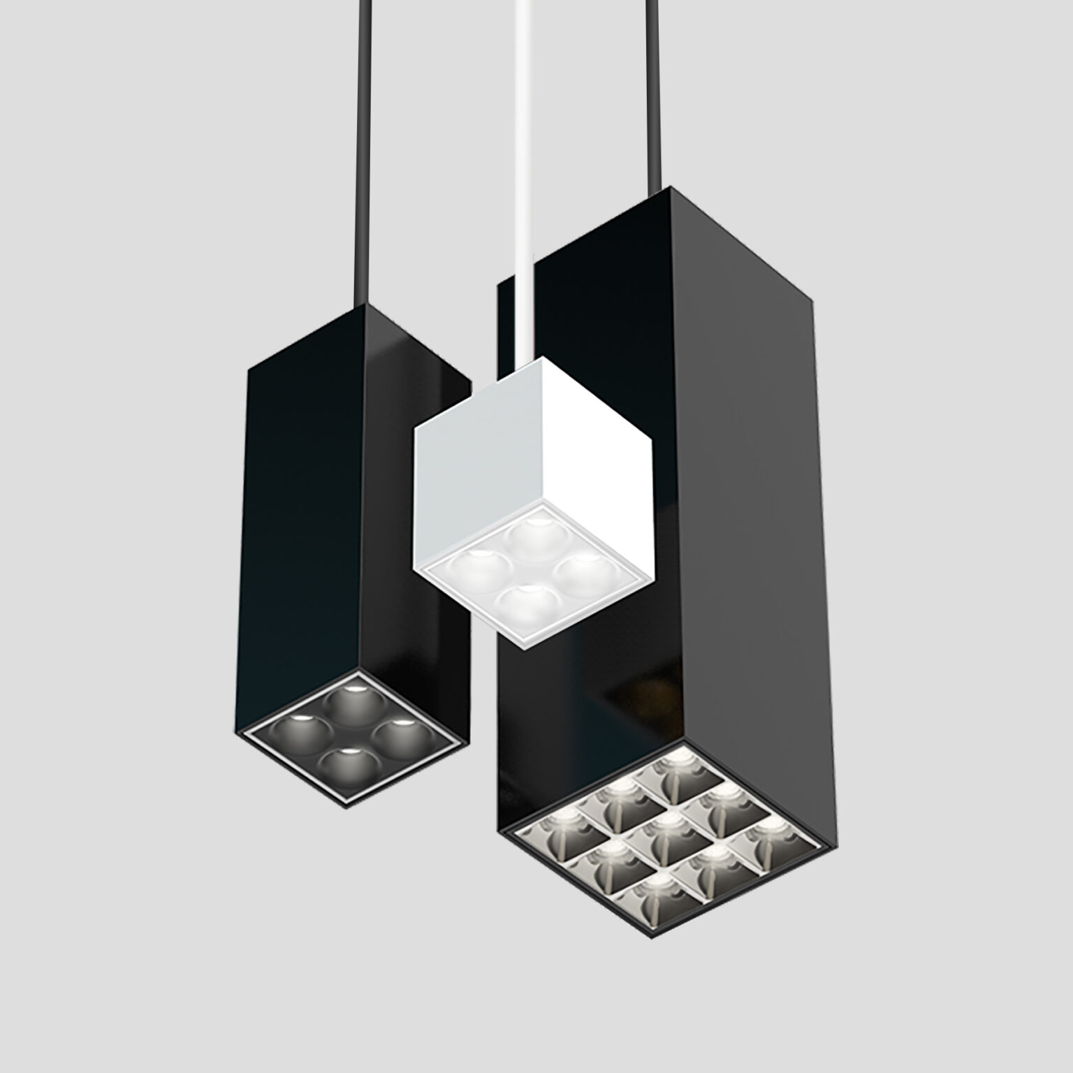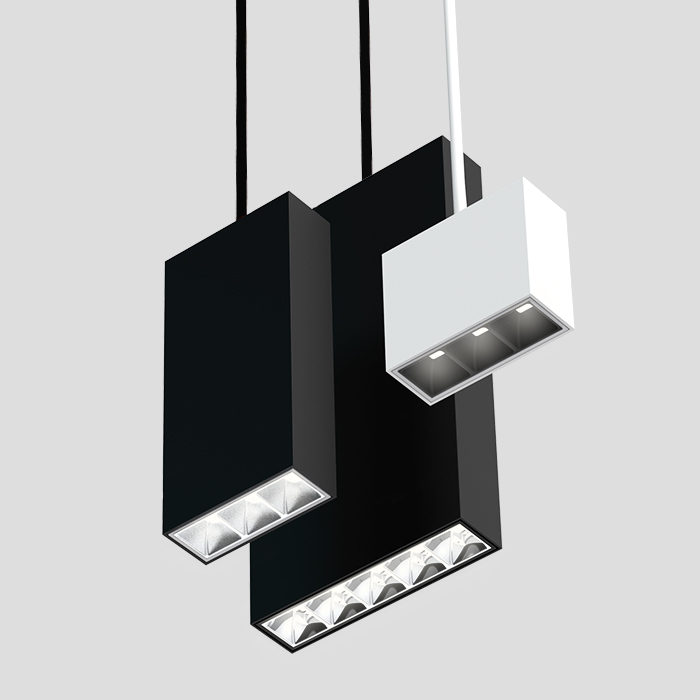 Cluster pendants include linear and cuboid configurations with downlight, parabolic, and wall-wash optics that match recessed types. Linear pendants are available in 1-, 3-, and 5-cell configurations, and cuboid pendants are available in 2″ × 2″ and 3″ × 3″ arrays. Pendant Clusters fit a choice of 3″, 8″, or 12″ deep cuboid enclosures. Nominal light output is 200 lumens per cell, with efficacy over 80 LPW. Pendant Clusters can be suspended using stems, and a canopy for conduit connection is available. The driver is either integral or remote and is capable of powering multiple luminaires.
