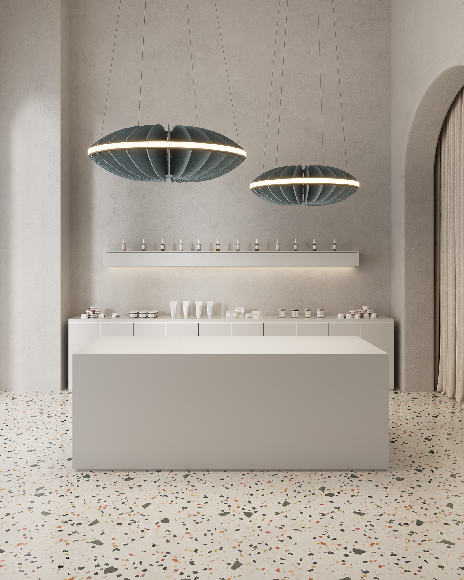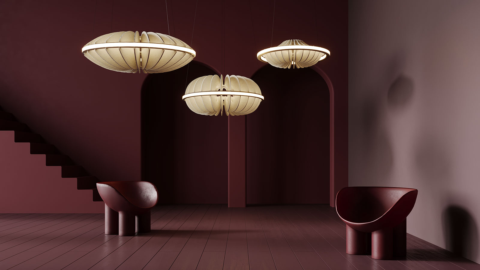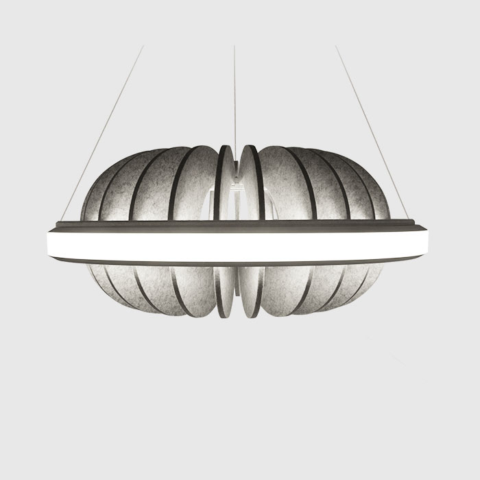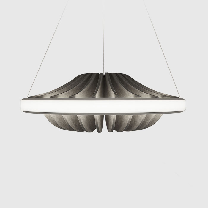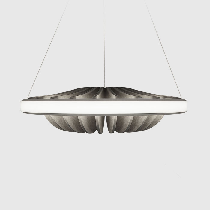 Equally intentional in function and form, Folia Acoustix luminaires are made with sound absorbing textiles created from recycled single-use bottles. By extending the life of these plastic materials, we can reduce landfill that threatens not only our health, but that of our planet.