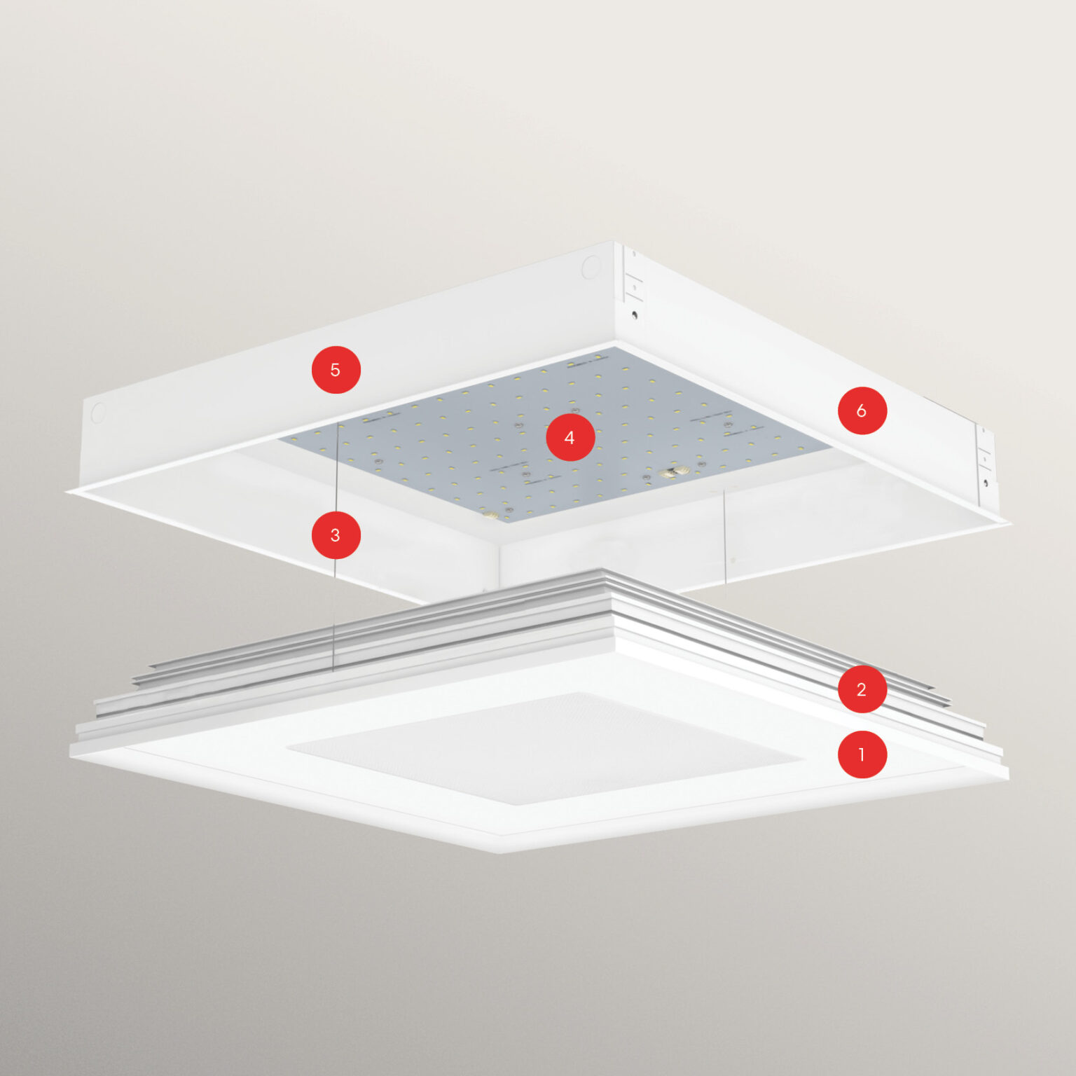 Mid-power LED’s, direct-mounted to luminaire housing for thermal dissipation. Spaced for uniform illumination of the optical cavity. Replaceable, with quick-connect wiring.