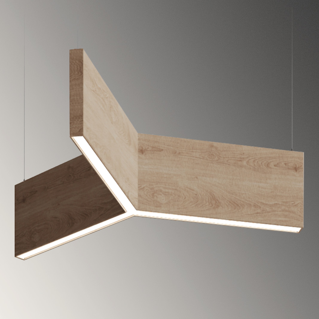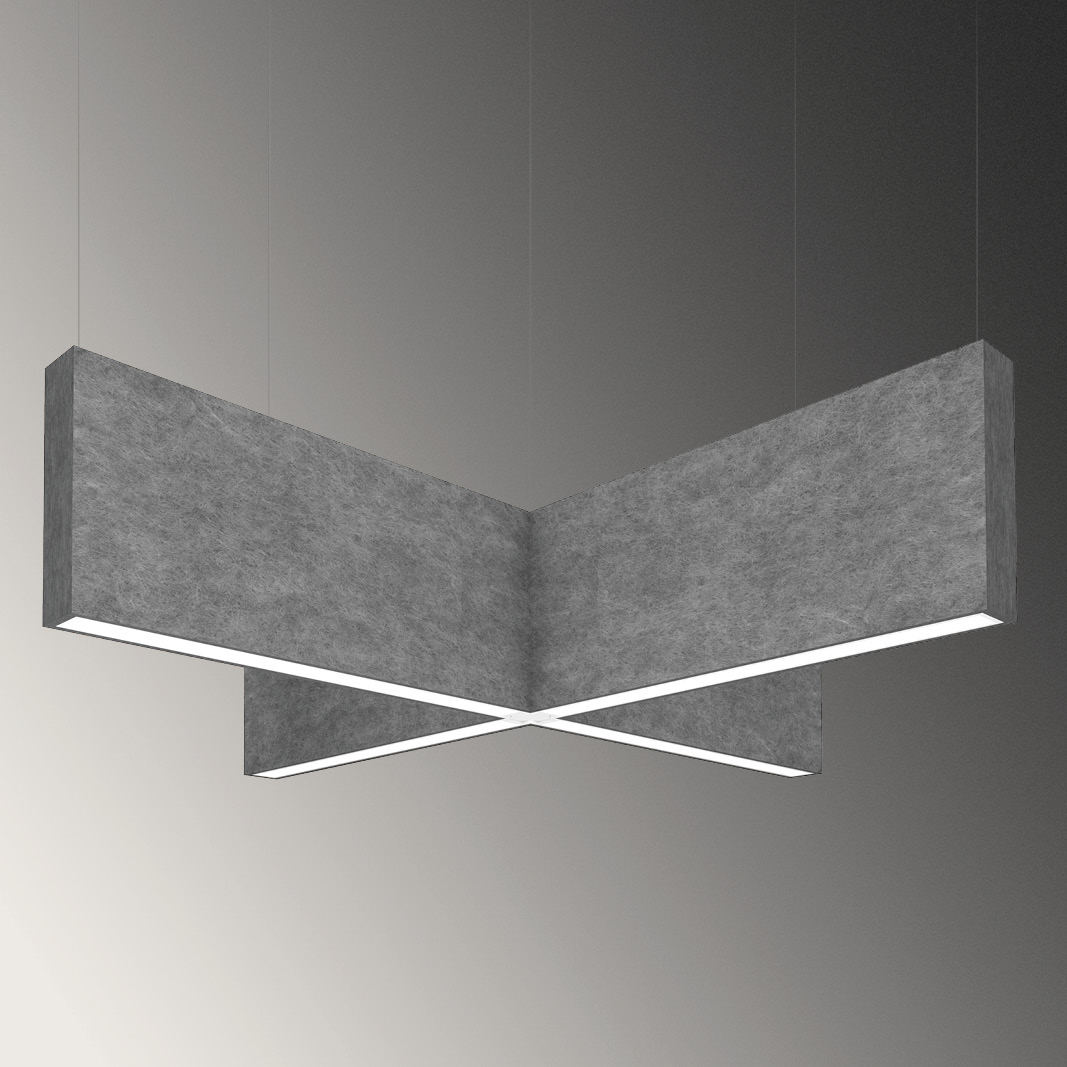 Squero Acoustix fixtures are also available in preassembled V, X, and Y spoke shapes, created by linear units joined together with custom hubs. Shipped directly from the factory, the spokes add visual interest and dynamism to any space.