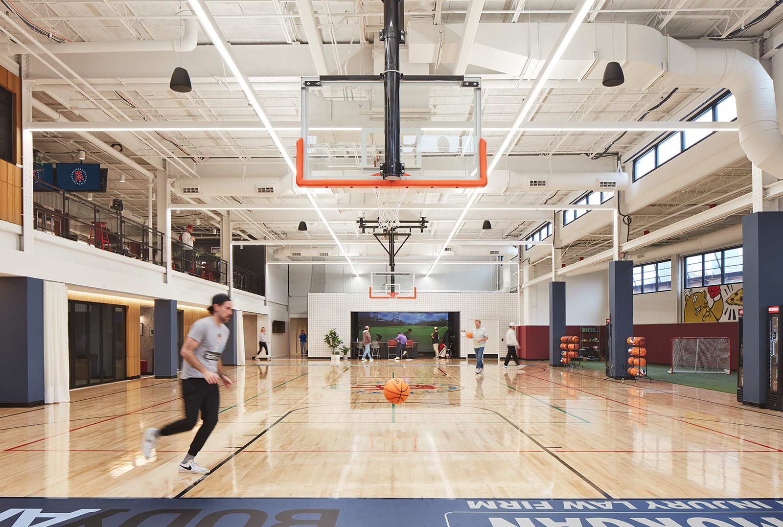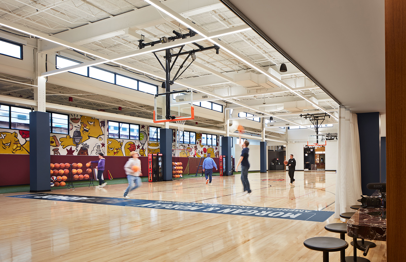 Located in Chicago’s trendy Fulton Market District, Barstool Sports’ corporate head office is a workspace like no other. Envisioned by the client and architects as a 33,000-square-foot “fun factory”, the space features podcast and broadcast studios, bar areas, offices, a commercial kitchen and even a full-sized basketball court, spread over two stories of historic loft space.