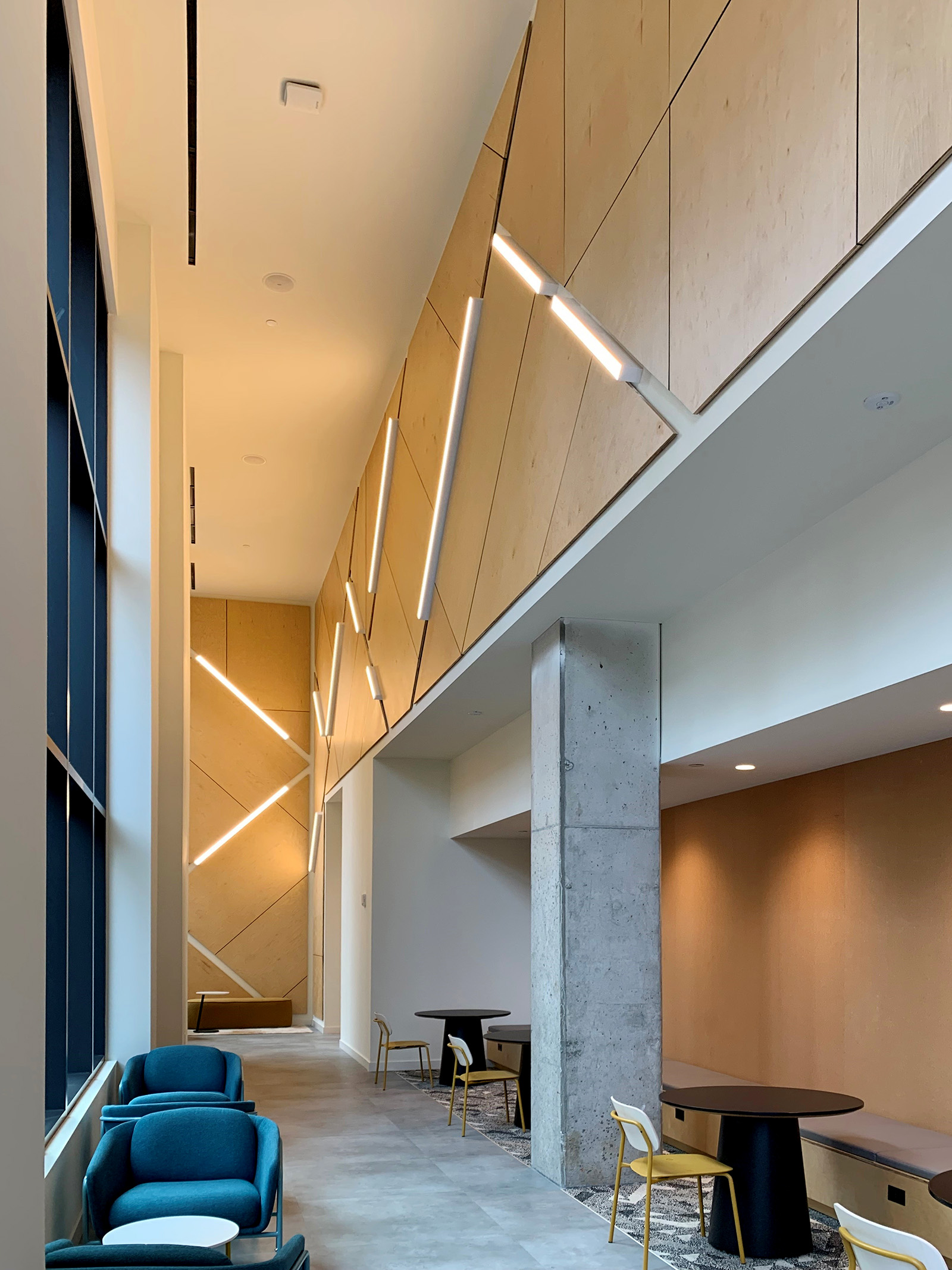 Student living ain’t what it used to be. Parc View at Commonwealth, located near Virginia Commonwealth University, reimagines student housing as an integrated 16-storey vertical community. In collaboration with architect-designers Hickok Cole, Lumenwerx developed a comprehensive lighting strategy to tie it all together, from living and study areas to coworking lounges, fitness spaces, and more.