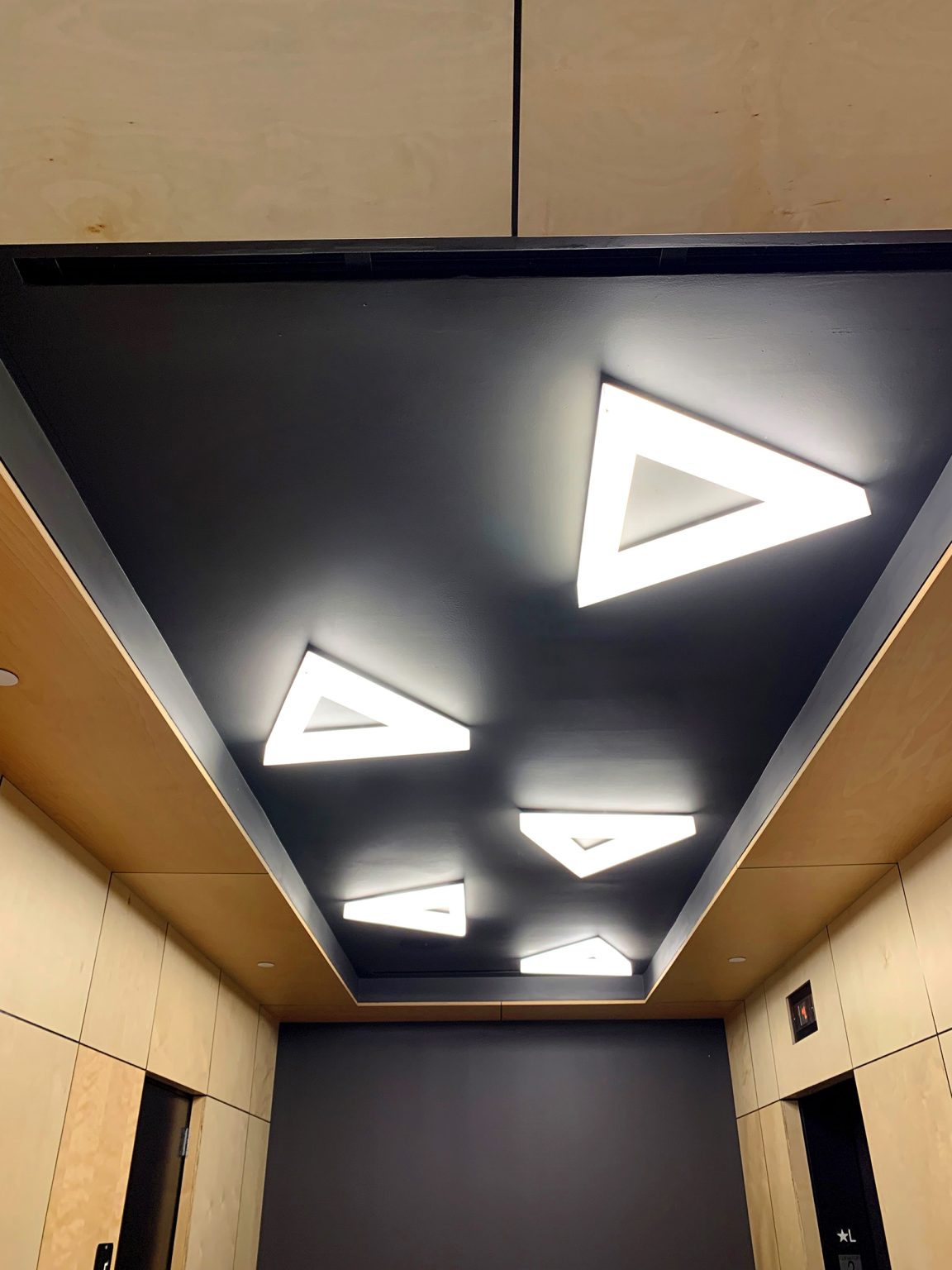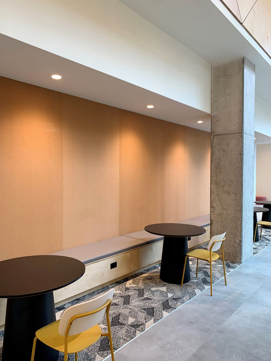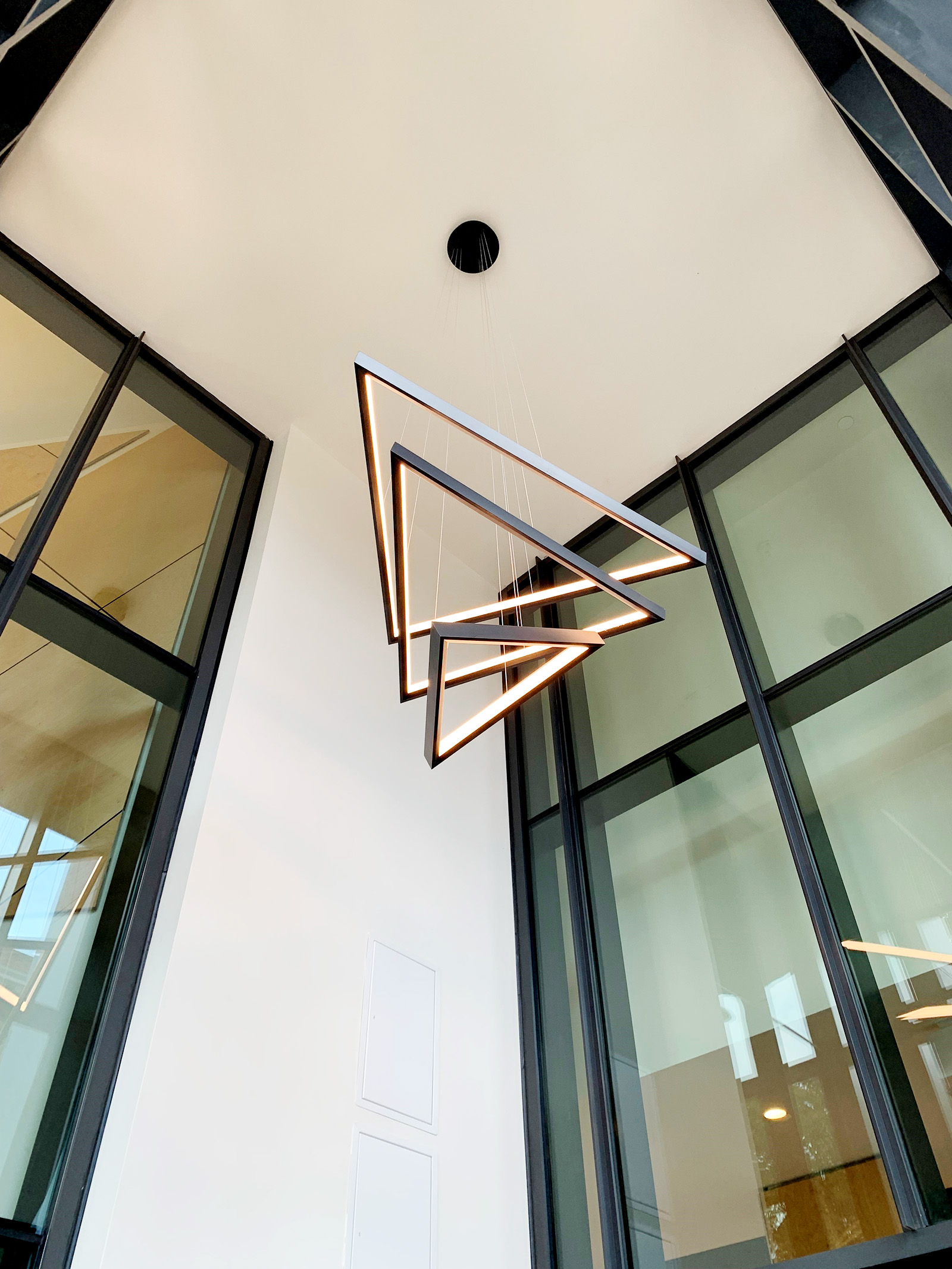 In areas that require more precise accent lighting, we selected Voilà Downlight luminaires with integrated high-performance optics. These give the design team the flexibility to highlight key architectural elements while maintaining a refined ceiling plane. Additional decorative lighting elements bring life and interest to Parc View’s social zones. Poly pendants introduce geometric forms and eye-catching visual accents, while Rim pendants create a warm, welcoming atmosphere through soft, halo-like illumination. Linear Arro pendants add an additional layer of overhead acoustic performance.