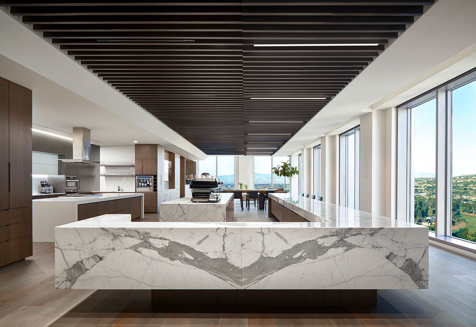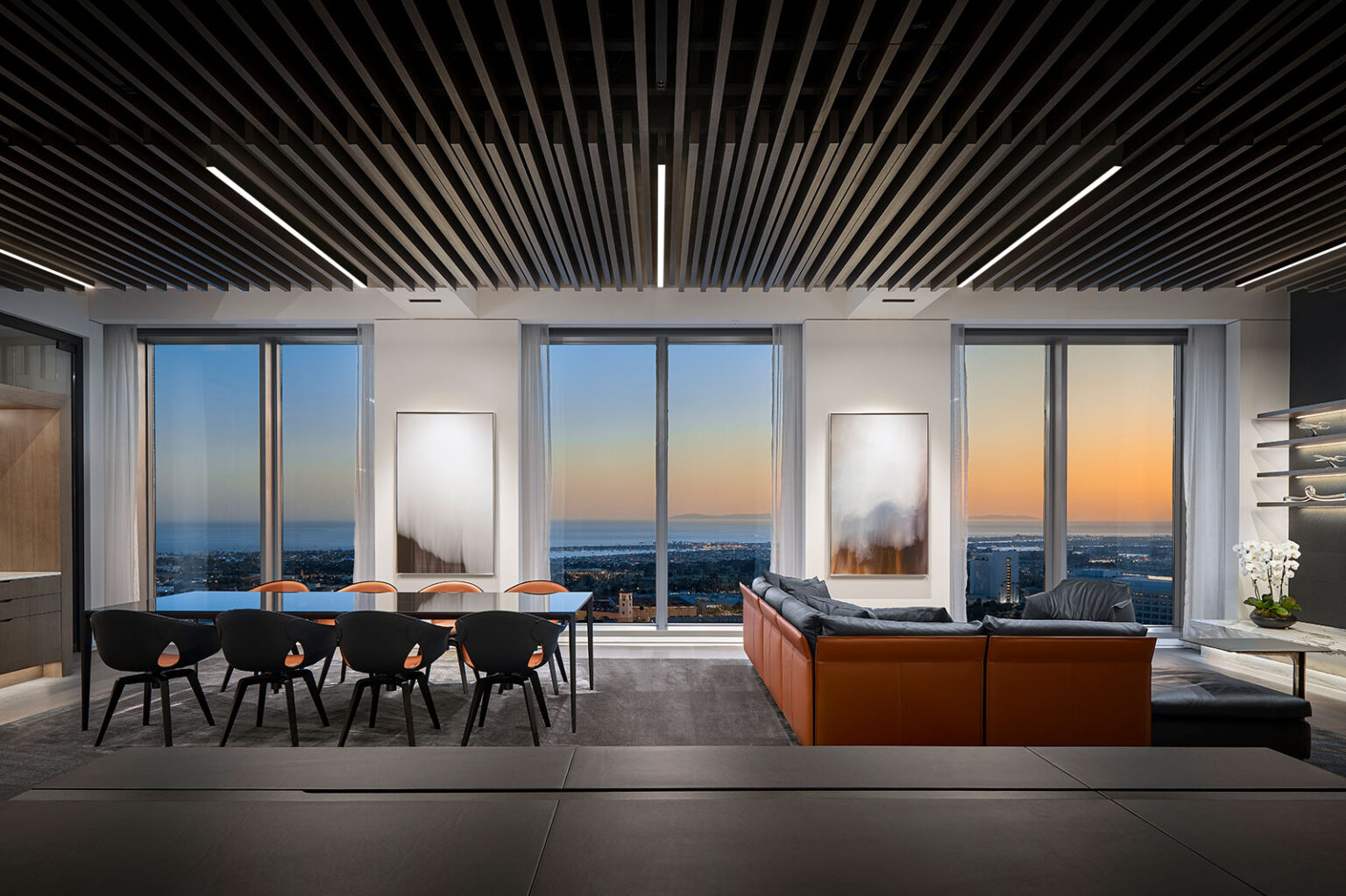 At T2’s Newport Beach headquarters, warmth, immersive illumination and a cozy feeling of home are on the menu. Designed by architecture firm Gensler, this stunning 13,089-square-foot penthouse with sweeping views of the Pacific Ocean, reimagines the modern workplace as a living space. The completed office evokes a luxury apartment, an apt scenario for an investment firm with deep roots in hospitality.